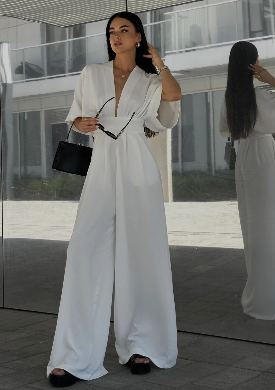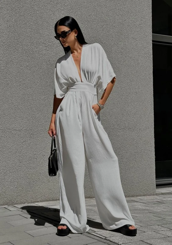 Biały kombinezon damski o stylowym kroju z luźną nogawką i efektownym dekoltem. Model w białym kolorze, wykonany z komfortowo zwiewnego materiału.