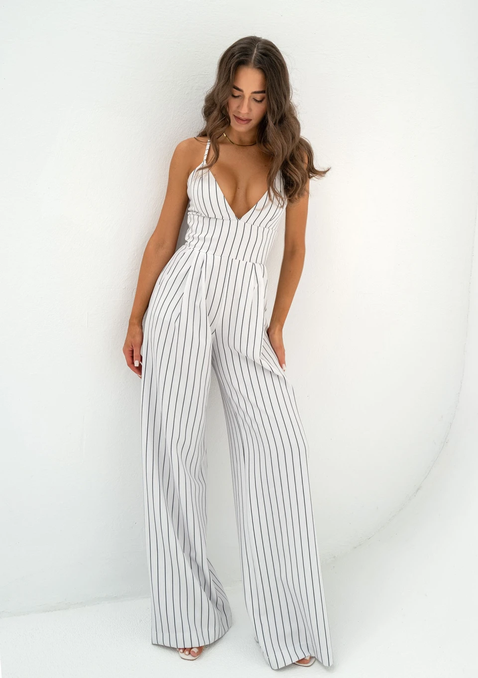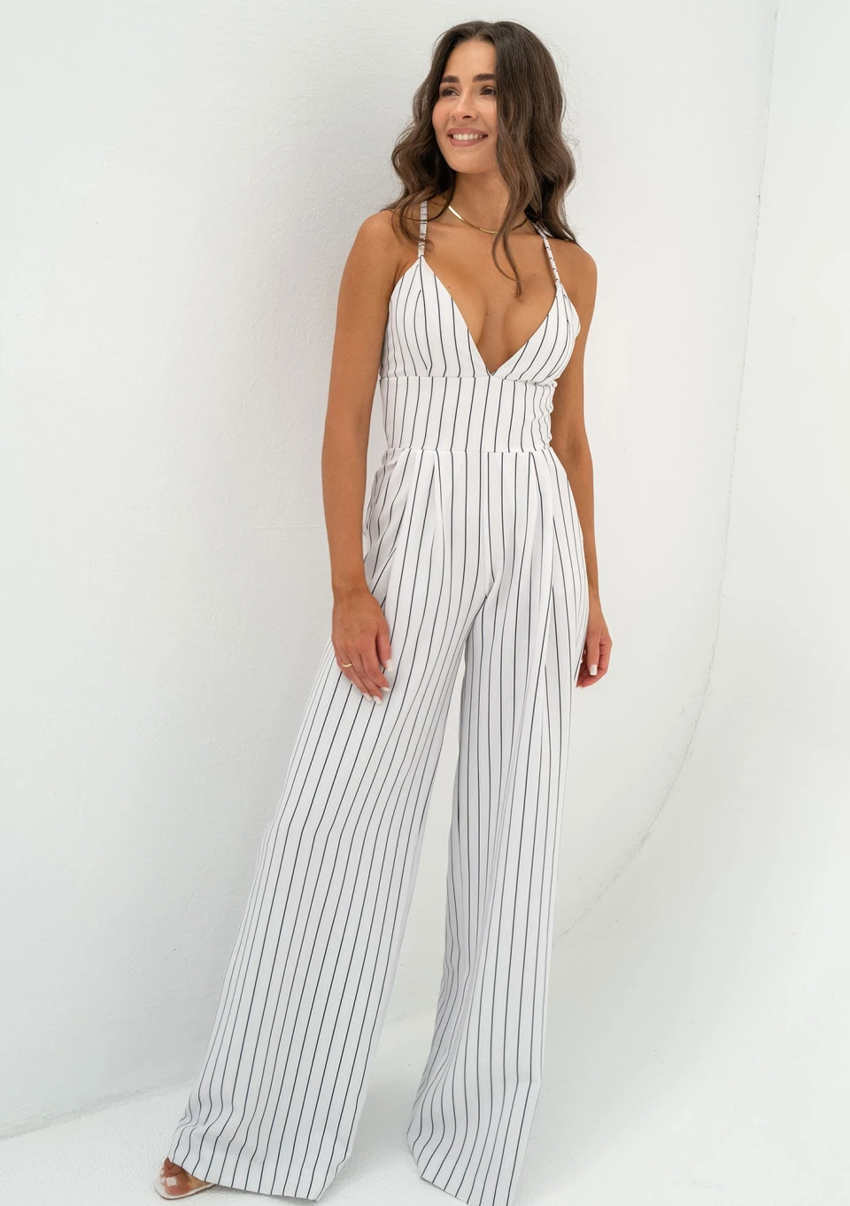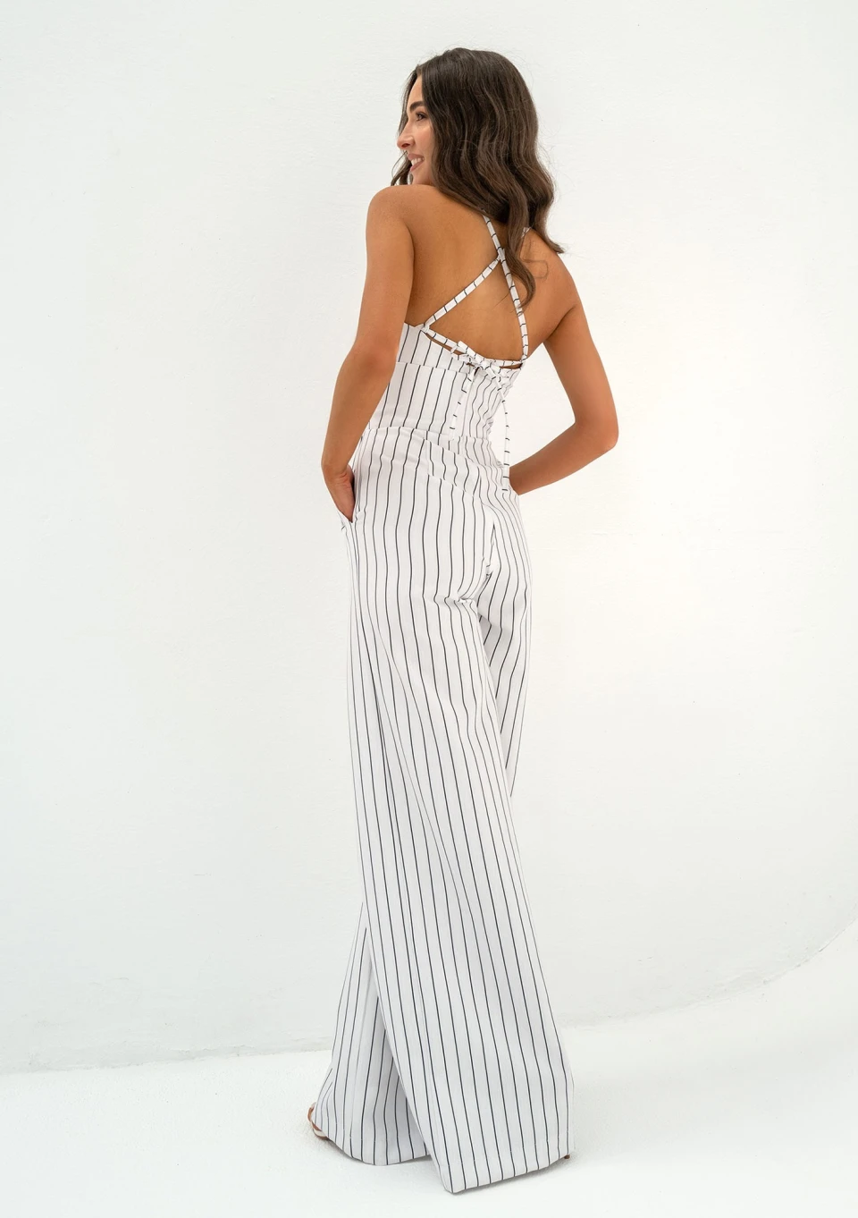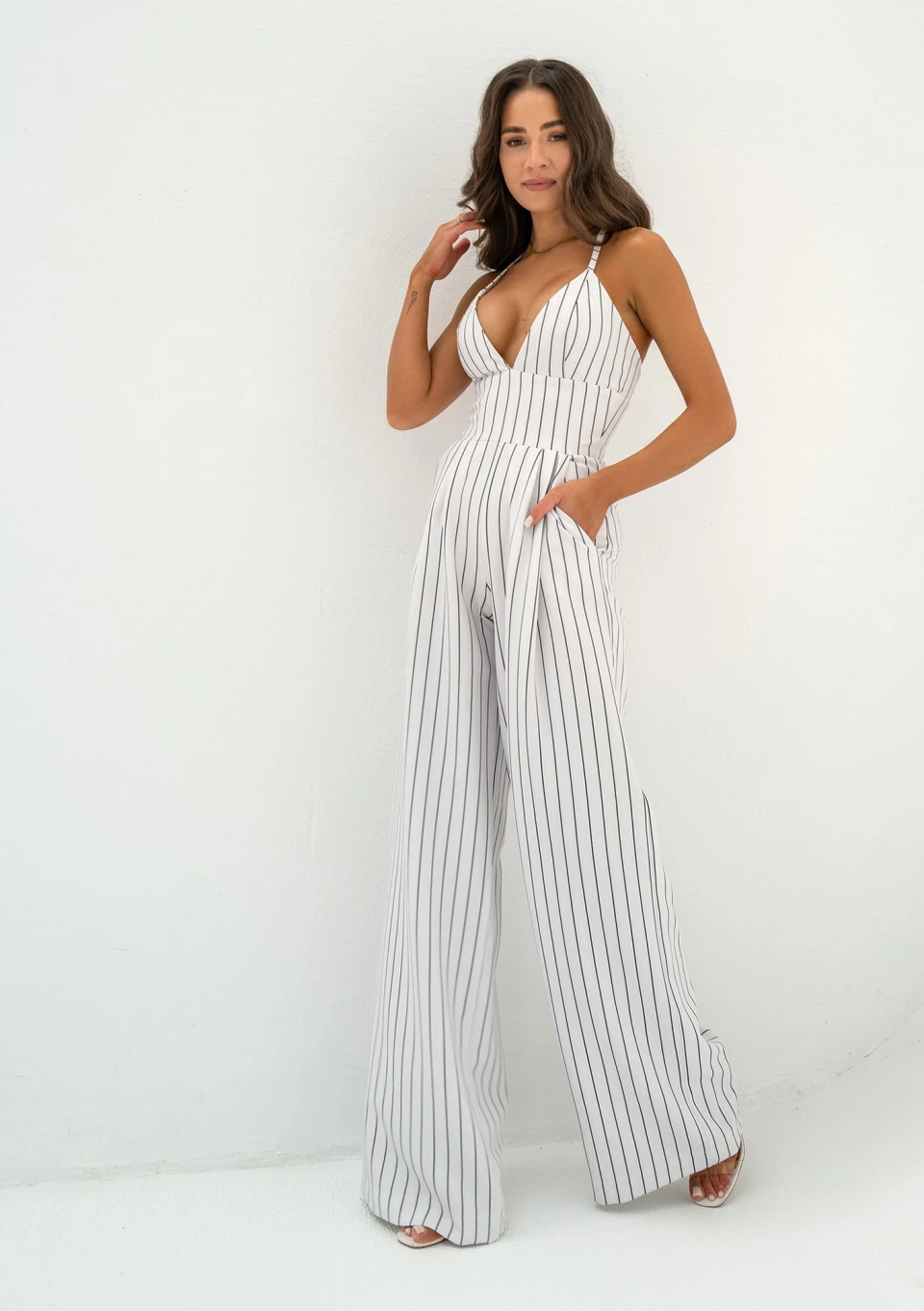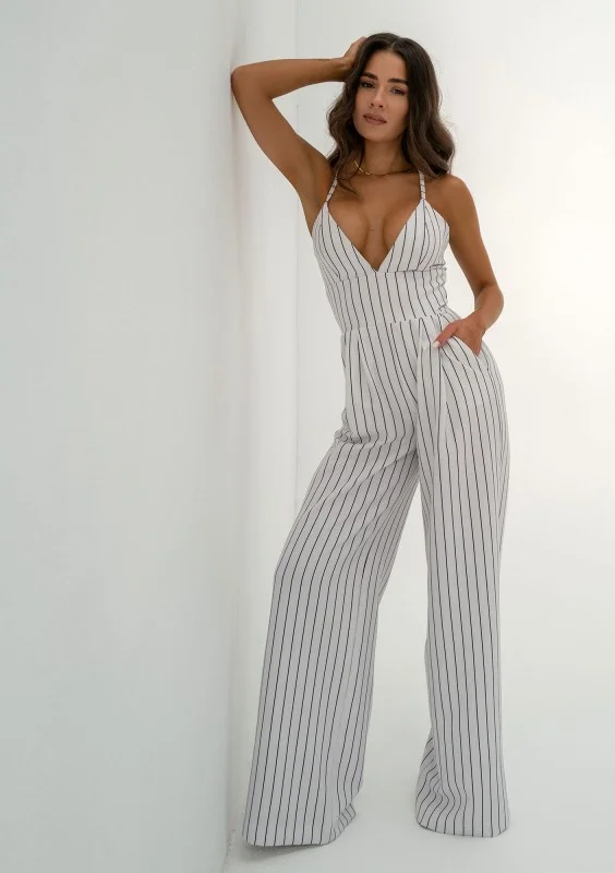 Stylowy kombinezon damski na ramiączkach, wykonany z tkaniny w prążki. Fason z kieszeniami, zapinany dyskretnym suwakiem.
