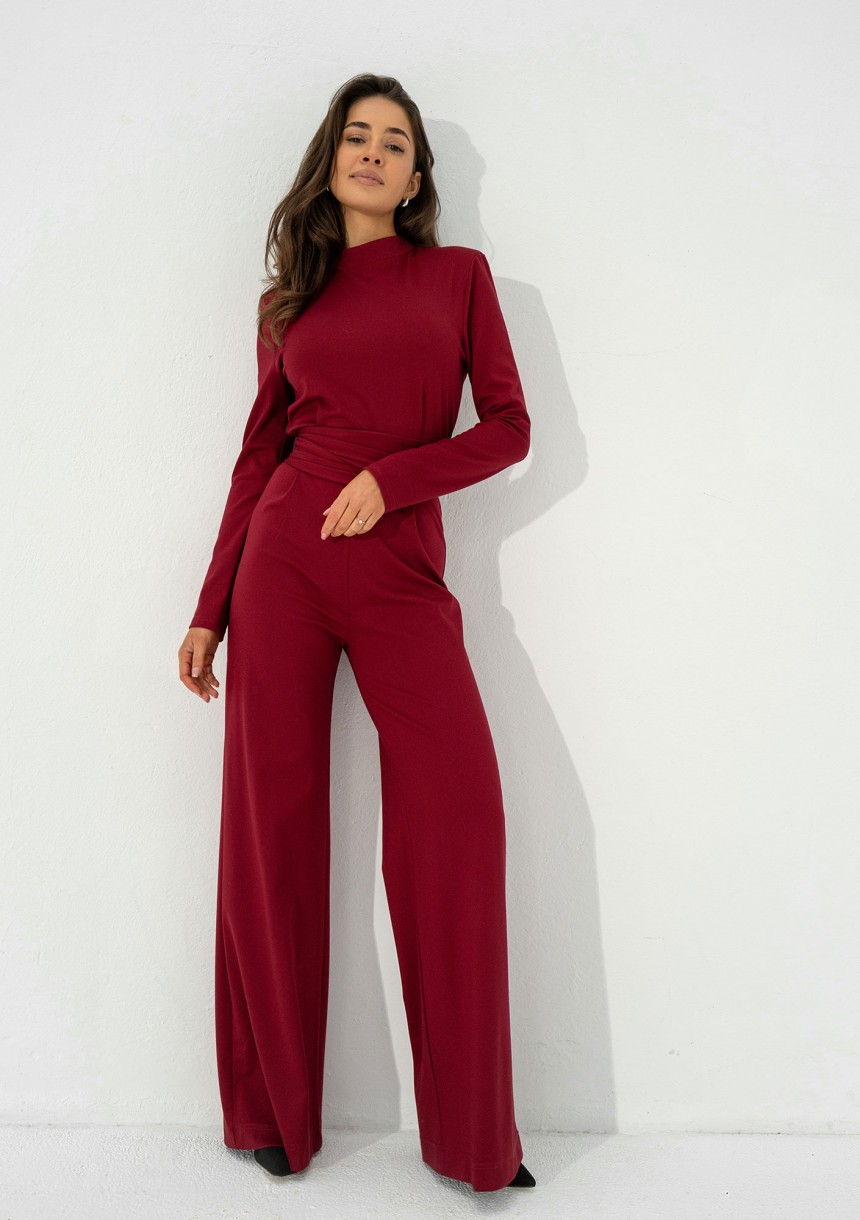 Olśniewający kombinezon damski na każdą, elegancką okazję. Wykonany w kolorze bordowym. Model o dopasowanej formie z pięknym wiązaniem.