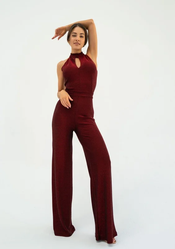 Bordowy kombinezon damski w eleganckim, wieczorowym stylu. Wykonany z błyszczącej tkaniny. Zasługuje na wyjątkowe okazje, takie jak święta, sylwester, wesele.