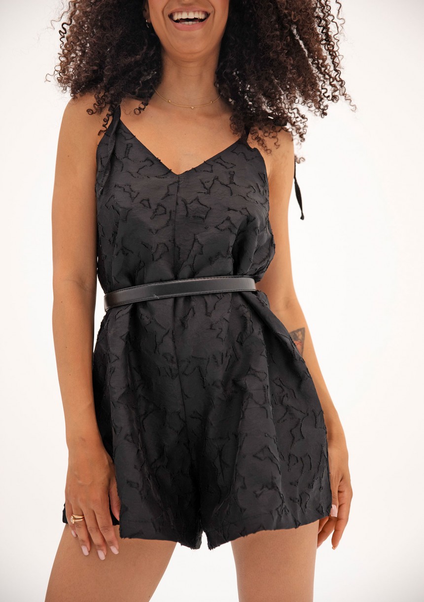 Cudny, eteryczny kombinezon damski na ramiączkach w czarnym kolorze. Wykonany z ażurowej tkaniny bawełnianej o strukturze kwiatów.