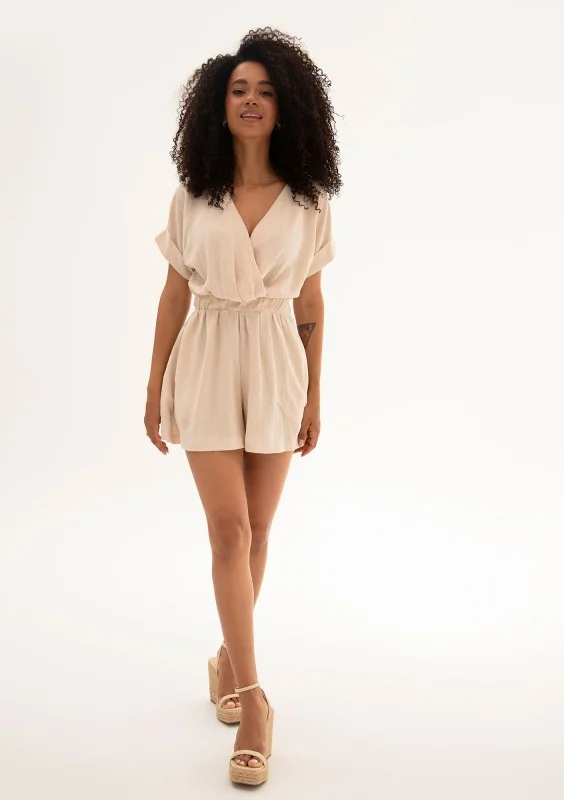 Beżowy kombinezon mini o wszechstronnym kroju mini z eleganckim, kopertowym dekoltem, gumką w talii i kieszeniami.