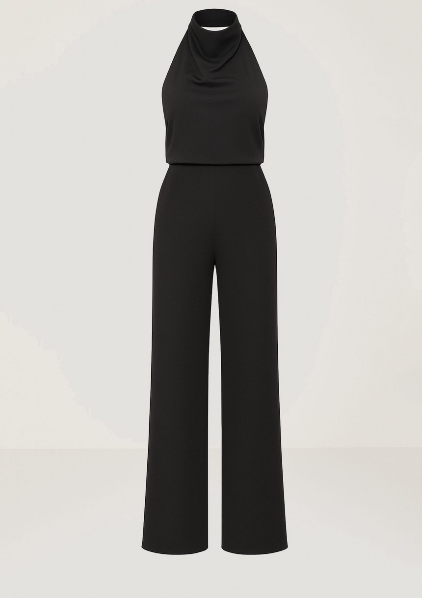 Wieczorowy kombinezon w eleganckim, czarnym kolorze. Model ma szerokie nogawki i dekolt typu halter, eksponuje plecy i ramiona.