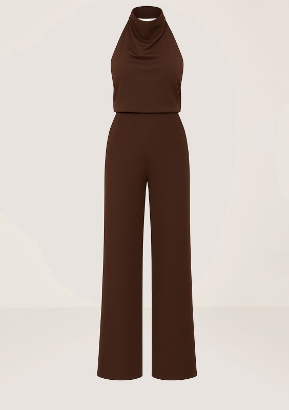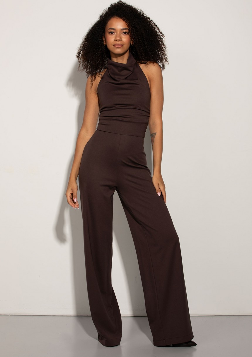 Elegancki kombinezon damski w brązowym kolorze. Z modną, szeroką nogawką i zmysłowo odkrywającym plecy dekoltem typu halter.
