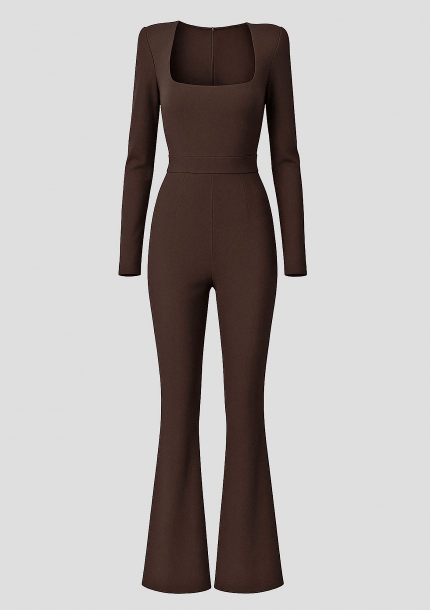 Szalenie zmysłowy kombinezon o dopasowanej formie, z rozszerzoną nogawką i ponętnym dekoltem karo. Model w ciemnym, brązowym kolorze.