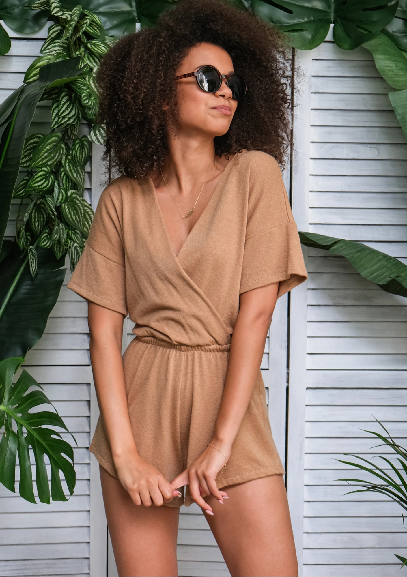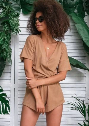 Kombinezon ma krótkie rękawy, luźno opadające wzdłuż ciała - rozszerzany materiał kończy się w okolicach łokci. Górna część zestawu pięknie podkreśla biust. Kopertowe przełożenie materiału eksponuje dekolt, a dodatkowo tworzy zwężenie w talii. Karmelowy kombinezon dla kobiet przewiązany jest w pasie elastyczną taśmą. Lekkie spodenki sięgają za linię bioder, luźno opadając wzdłuż ud i nie przylegając do skóry. Delikatna dzianina sweterkowa może być prana w pralce. Mocne szwy odporne są na rozdarcia i jednocześnie nie uciskają wrażliwej skóry pań. Materiał świetnie przepuszcza powietrze, dlatego kombinezon idealnie spisuje się w upalne dni. Można go nosić z ulubionymi kardiganami lub lekkimi kurtkami. Wyglądaj stylowo bez większego wysiłku!