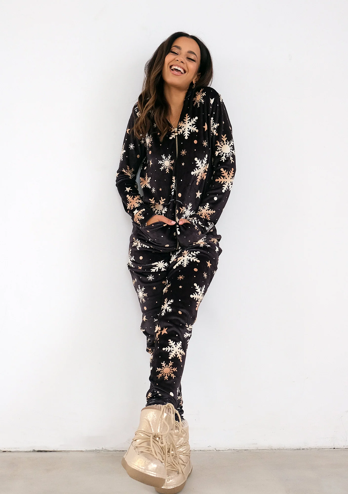 Kombinezon Lumi posiada kaptur i dwie drobne kieszenie z przodu. Zamek błyskawiczny jest wszyty wzdłuż tułowia z przodu. Wzór ubrania nawiązuje do zimy – to płatki śniegu i gwiazdki różnej wielkości. To przyjemnie miękki, lekko połyskujący model z aksamitnej tkaniny, w którym możesz nawet spać, jeśli jesteś wyjątkowym zmarzluchem. Kombinezon jest dostępny w rozmiarach XS – L.