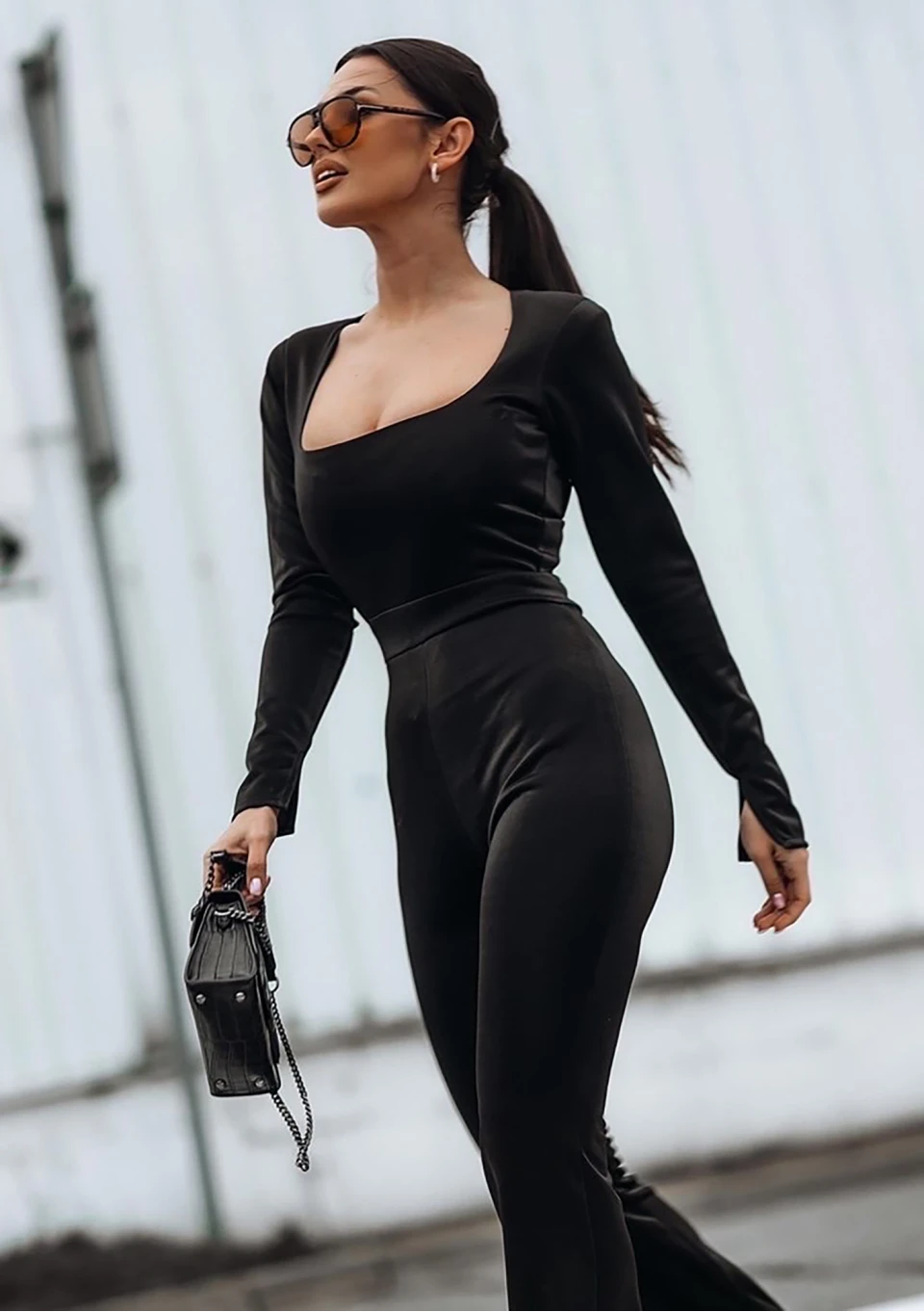 Błyszczący kombinezon wieczorowy z długim rękawem i modną, szeroką nogawką. Oczarujesz w nim zgrabnie zarysowaną sylwetką. To model z bardzo ponętnym dekoltem, który przyciągnie spojrzenia.