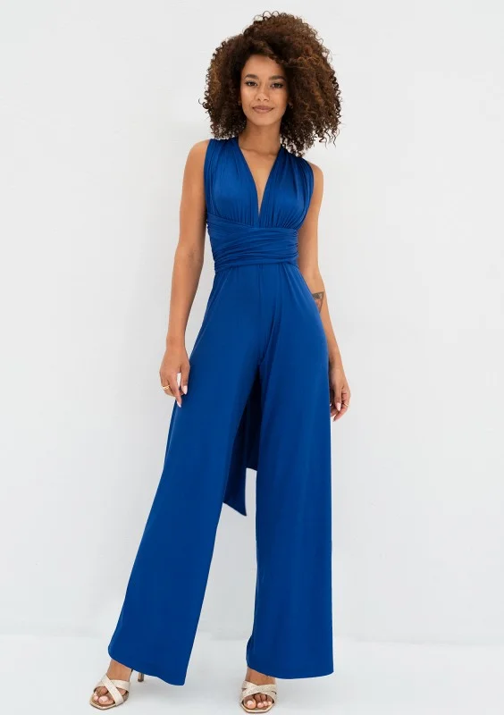 Elegancki kombinezon damski o delikatnie błyszczącej fakturze. Wszechstronny model w kolorze kobaltu, z dekoltem do zawiązania na różne sposoby.