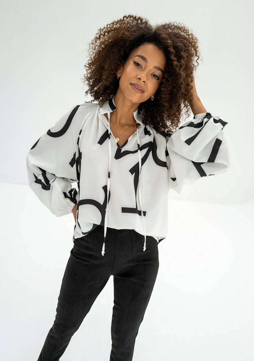 Biała koszula damska zdobiona wzorem liter naszego loga. Smaczku dodaje wiązana stójka. To koszula dla eleganckiej trendsetterki.