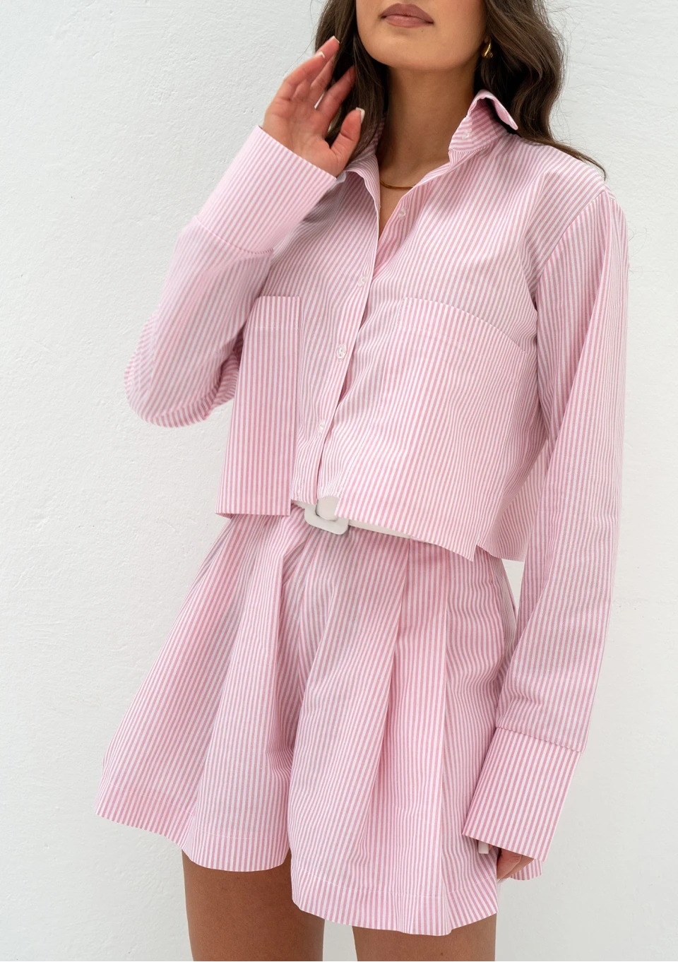 Stylowa koszula damska o krótkim, designerskim kroju crop. Fason zdobiony różowymi prążkami, uszyty z czystej tkaniny bawełnianej.