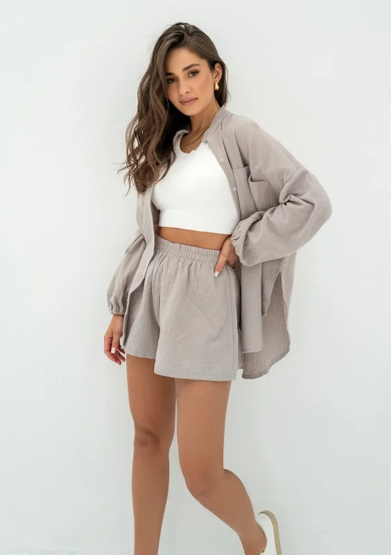 Wygodna koszula damska w naturalnym odcieniu taupe. Model o stylowym, półkolistym kroju oversize, uszyty z naturalnego muślinu.