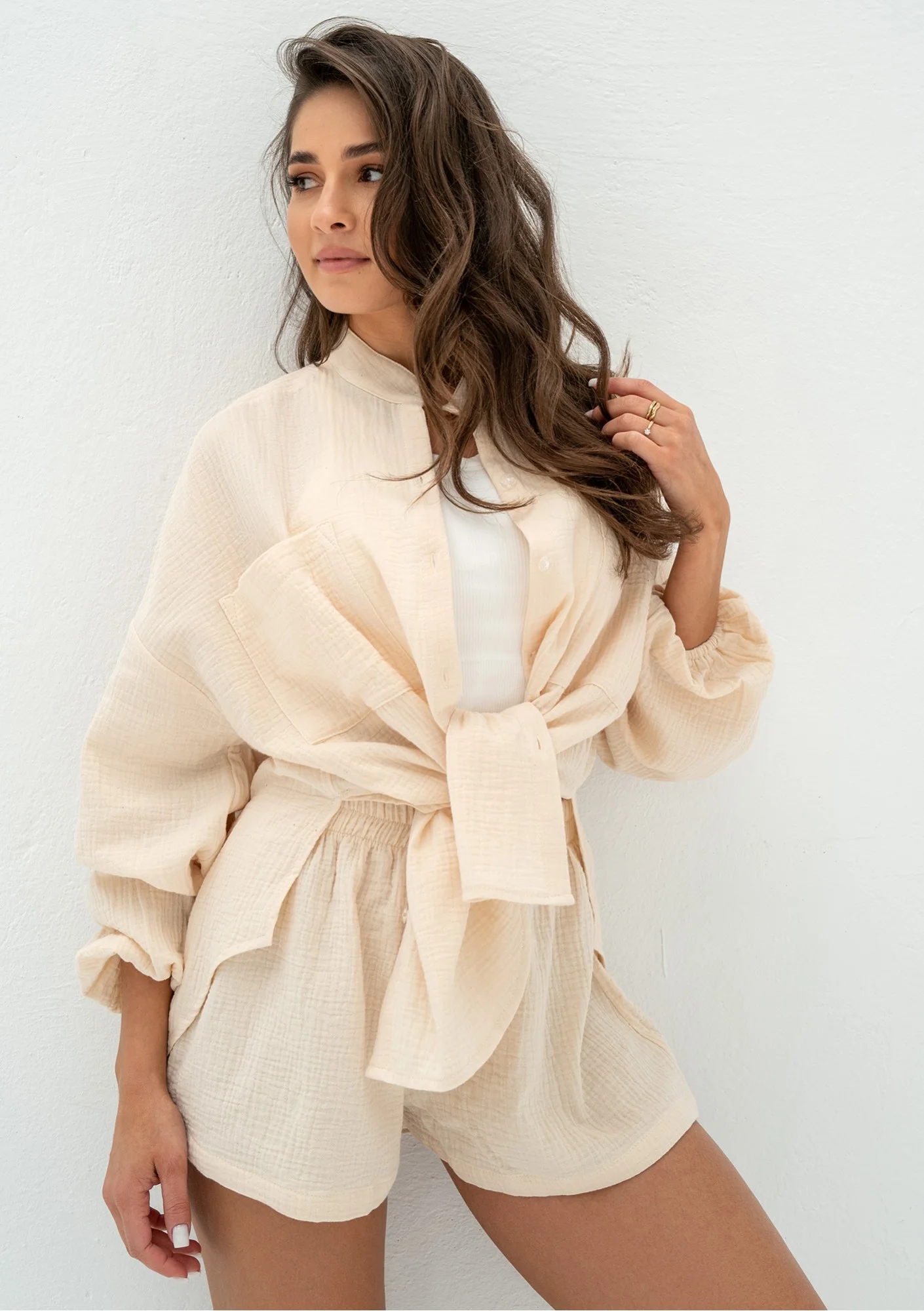 Muślinowa koszula damska w ślicznym, kremowym kolorze będzie cennym nabytkiem w upalnym, letnim sezonie. Osłoni Twoje ciało przed słońcem, ale i plażowym wiatrem. Zapewnia komfortowy przewiew, gdyż jest wykonana z naturalnej bawełny o najcieńszej, muślinowej strukturze. Jeśli poszukujesz kompletu, możesz zestawić ją z dedykowanymi szortami Palma lub Boco, które mają nieco wyższy stan i szerszy ściągacz w pasie. W tym samym kolorze przygotowaliśmy również długie spodnie, dlatego możesz dowolnie miksować fasony i stworzyć swój własny, wymarzony komplet muślinowy.