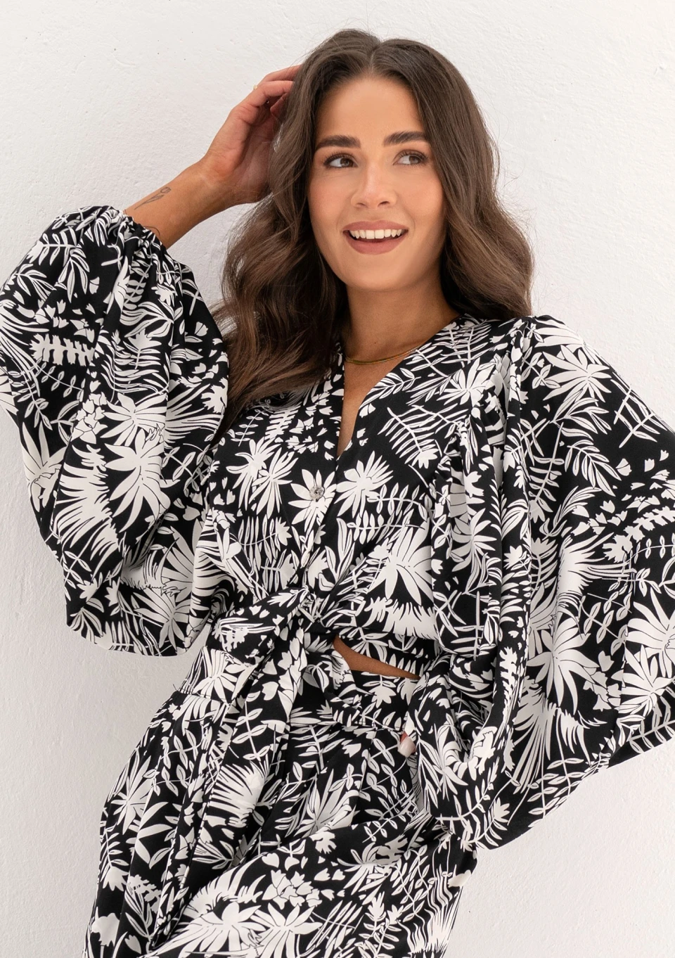 Elegancka koszula damska z luźnym rękawem i wiązaniem w talii. Uszyta ze zwiewnej tkaniny o kreszowanej fakturze, we wzór białych liści.