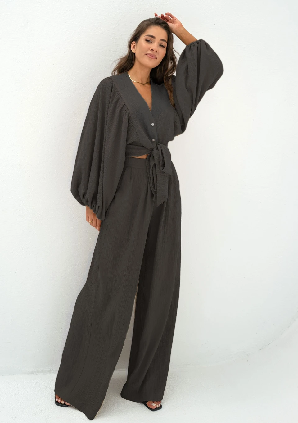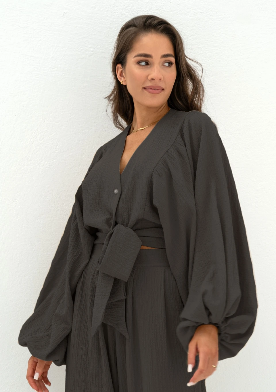Czarna koszula z luźnym rękawem i eleganckim wiązaniem w talii. Wykonana ze zwiewnej tkaniny o kreszowanej fakturze.