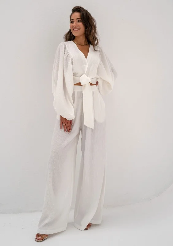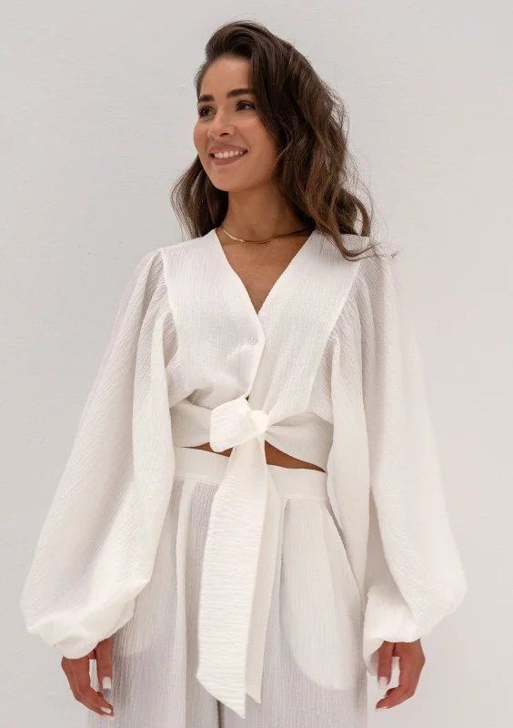 Biała koszula z luźnym rękawem i eleganckim wiązaniem w talii. Wykonana ze zwiewnej tkaniny o kreszowanej fakturze.