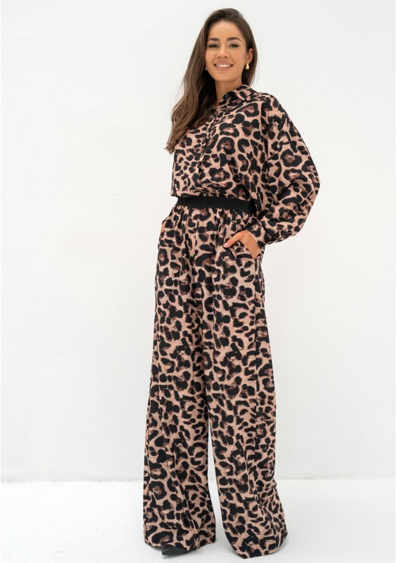 Elegancka koszula damska z delikatnej, satynowej tkaniny. zdobiona odważnym wzorem panterki. Model o luźnym kroju, dłuższym z tyłu.