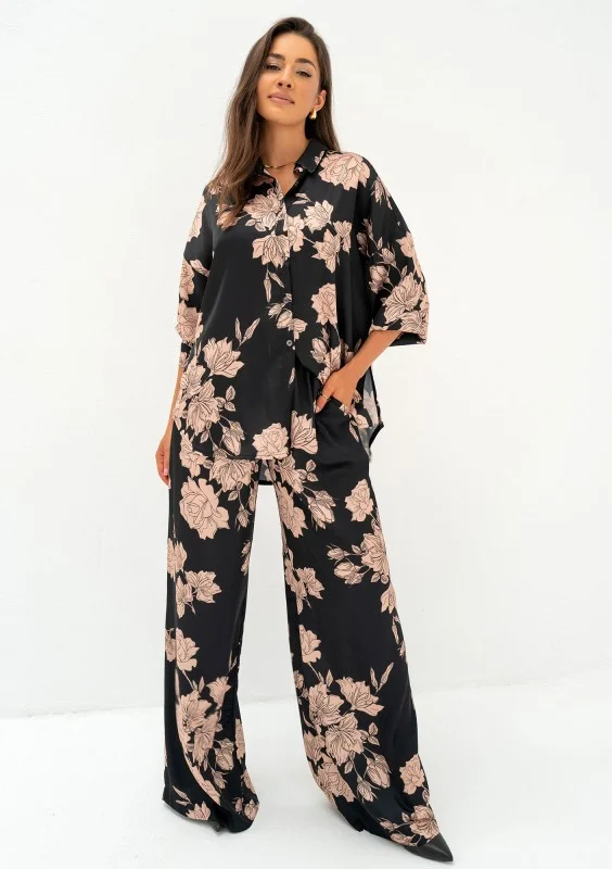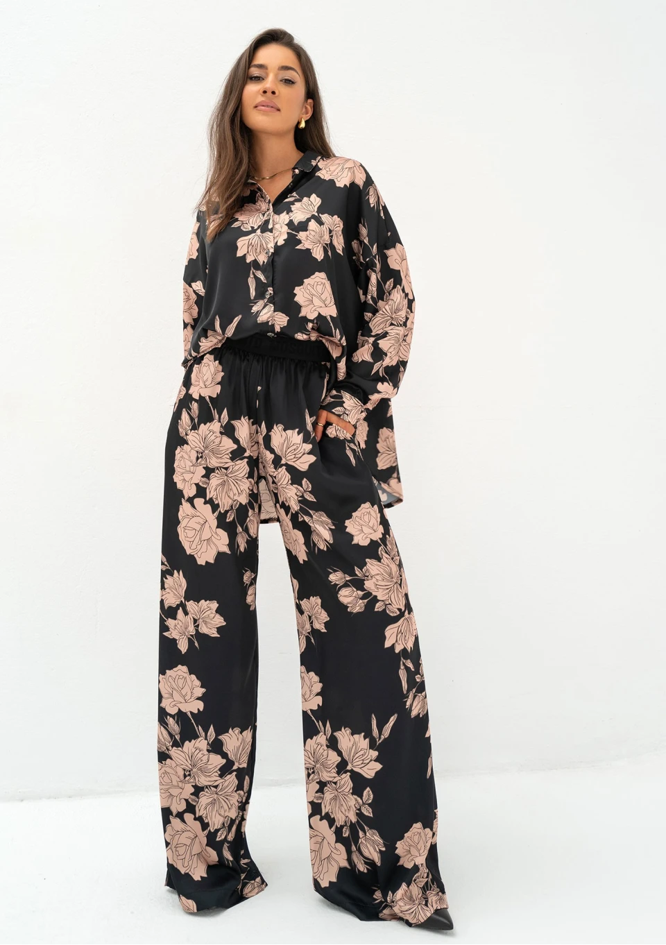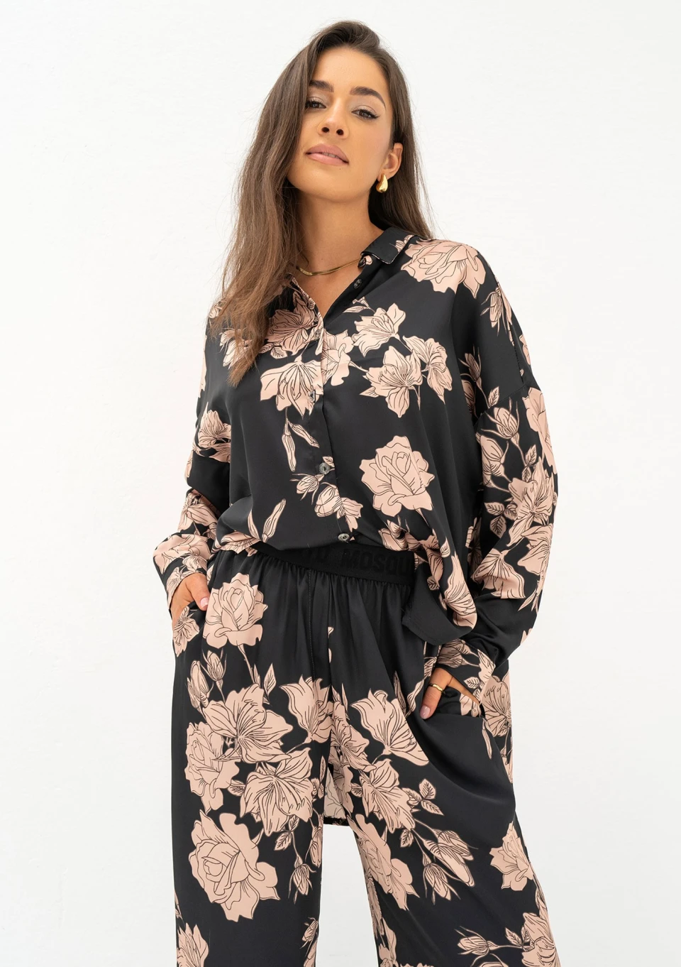 Elegancka koszula damska z delikatnej, satynowej tkaniny. zdobiona beżowym wzorem róż. Model o luźnym kroju, nieco dłuższym z tyłu.