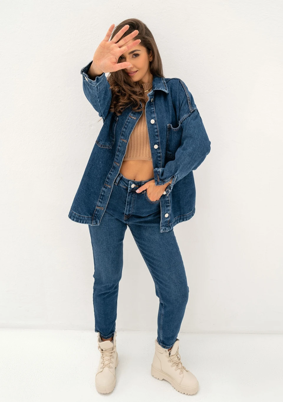 Granatowa koszula damska jeansowa w formie oversize. Zapinana na metalowe guziki. Wykonana z klasycznego denimu.