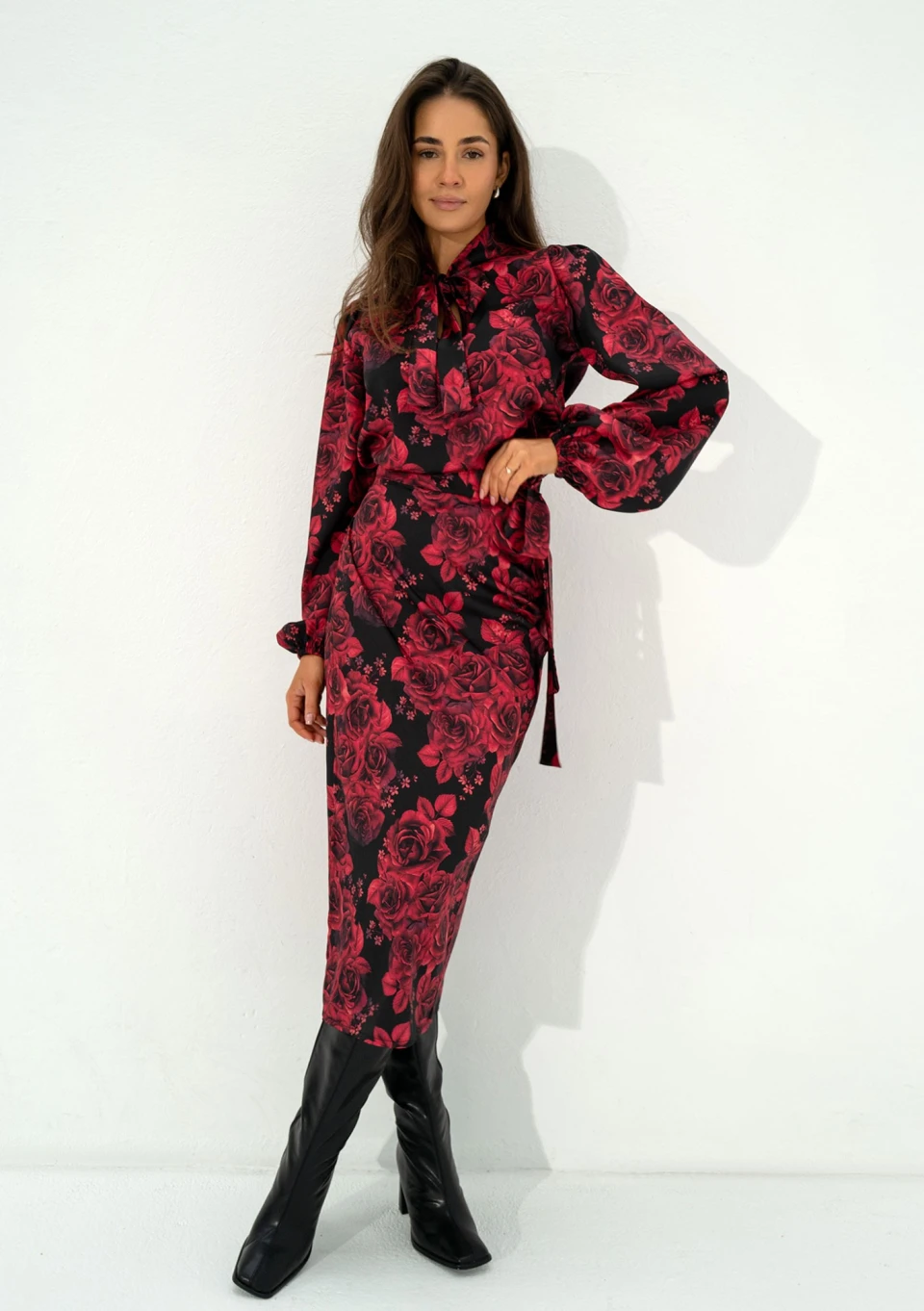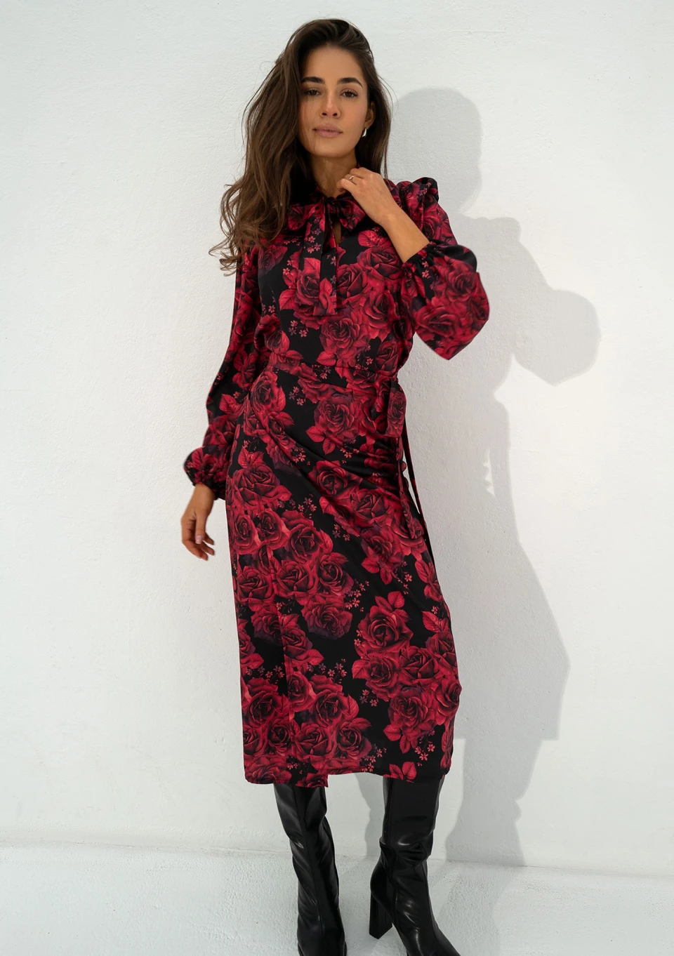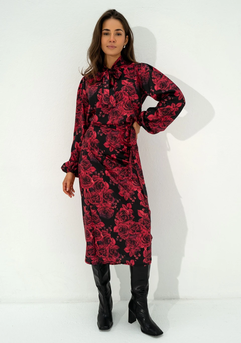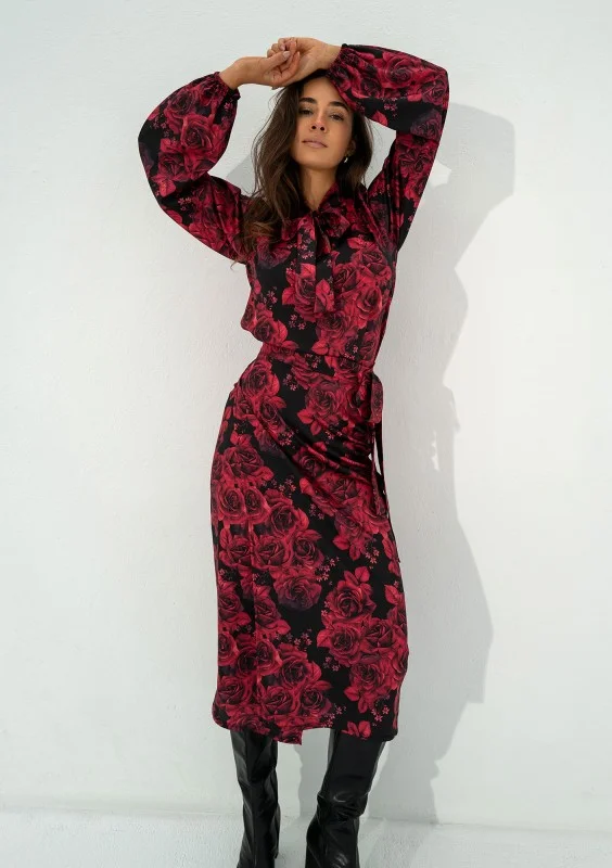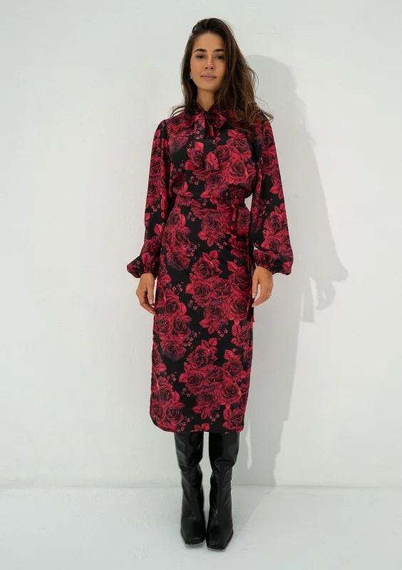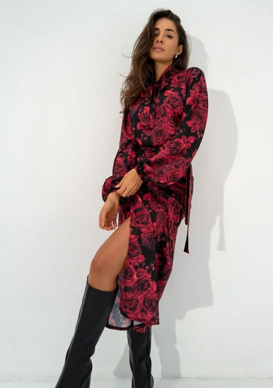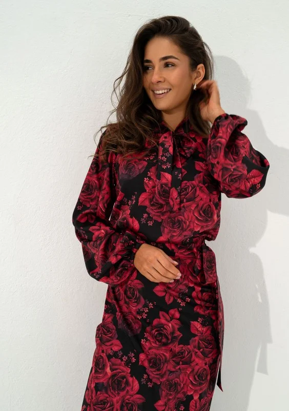 Kolory koszuli damskiej Kinsley znakomicie wpisują się w trendy chłodnego sezonu! Starannie zaprojektowana i uszyta z wysokiej jakości tkaniny, koszula ułatwi Ci planowanie codziennego outfitu do pracy czy inną okazję, w której będziesz chciała wyglądać elegancko, profesjonalnie, a także kobieco. Zmysłowy print bordowych kwiatów idealnie współgra z szykownym wiązaniem. Koszula jest bardzo wygodna, pozbawiona guzików. Rękawy zapewniają poczucie komfortu, wykończone są elastycznymi gumkami. Tkanina jest bardzo komfortowa, a sprężyste włókna umożliwiają odpowiedni przepływ powietrza. Stwórz piękny komplet, do zakupu koszuli dodaj dedykowaną spódnicę kopertową o tym samym wzorze.