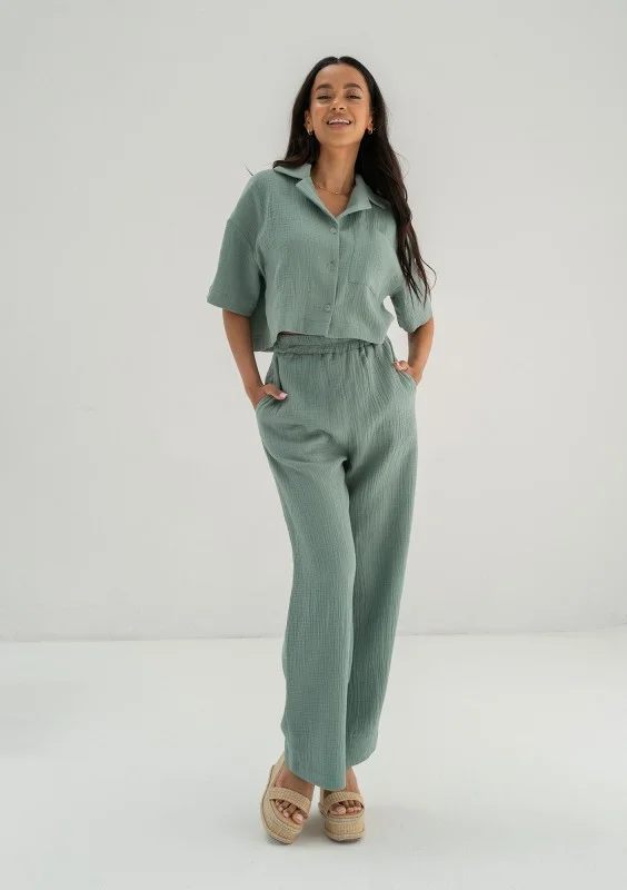 Klasyczna koszula damska o nieco skróconym fasonie, wykonana z przewiewnej i miękkiej tkaniny muślinowej. W miętowym odcieniu.