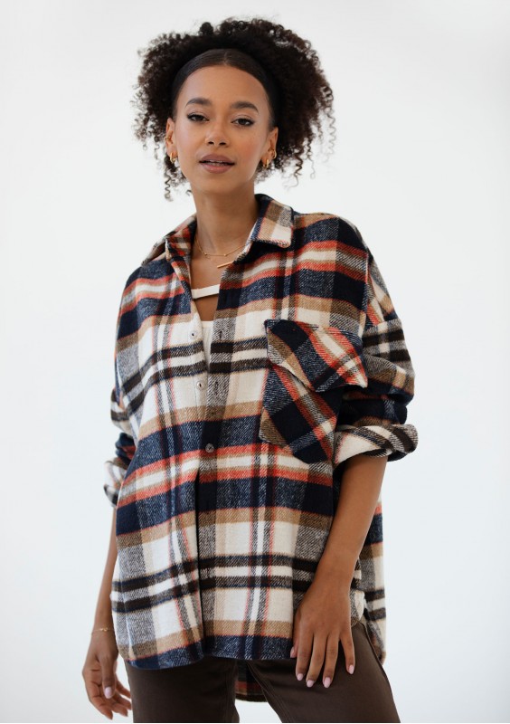 Flanelowa koszula damska w kratę. Model w stylowej kolorystyce. Fason delikatnie oversize'owy.