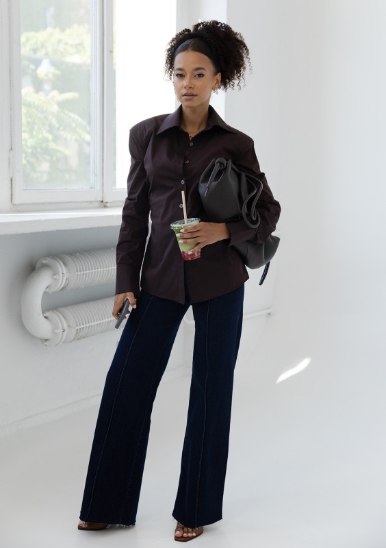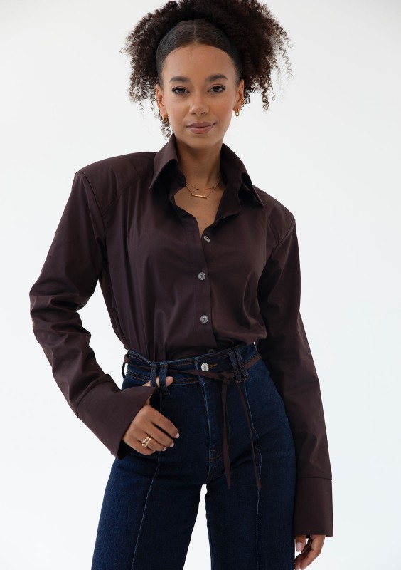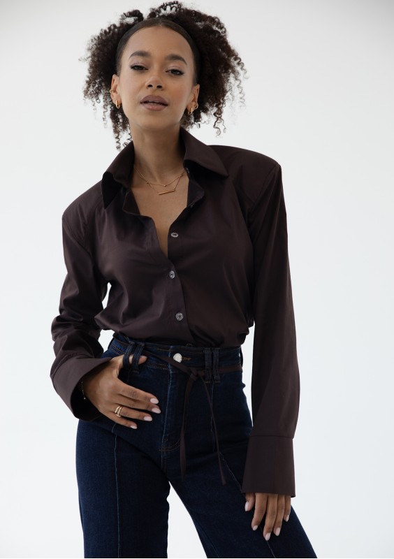 Brązowa koszula damska Isay to fason o niezwykle dopracowanym kroju. Doskonale modeluje sylwetkę wiązaniem w talii i poduszkami na ramionach.