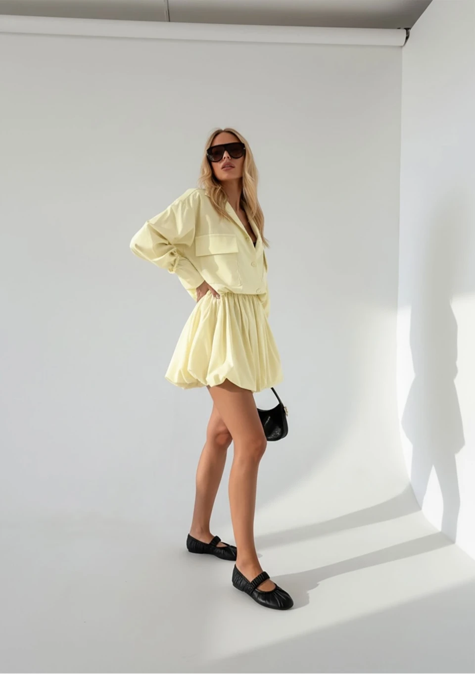 Cytrynowy odcień to jeden z najważniejszych kolorów sezonu: delikatny, świeży, bardziej „luksusowy”, niż klasyczna żółć. Pięknie podkreśla opaleniznę! Za to przy luźnym kroju naszej koszuli Floe można postawić znak równości z dopiskiem wygoda i nonszalancja! Duże kieszenie i szerokie rękawy z dekoracyjnymi wiązaniami wpisują się w modny, wiosenny look. Koszulę możesz nosić wpuszczoną, jak i jako rozpiętą narzutkę. Do jeansów, spodni fakturowanych, dzianin, a nawet sukienki - ten model zwieńczy wiele propozycji! Jeśli chcesz zachować delikatną, spójną estetykę, zbuduj zestaw z dedykowaną spódniczką o modnym kroju bombki.