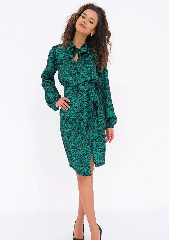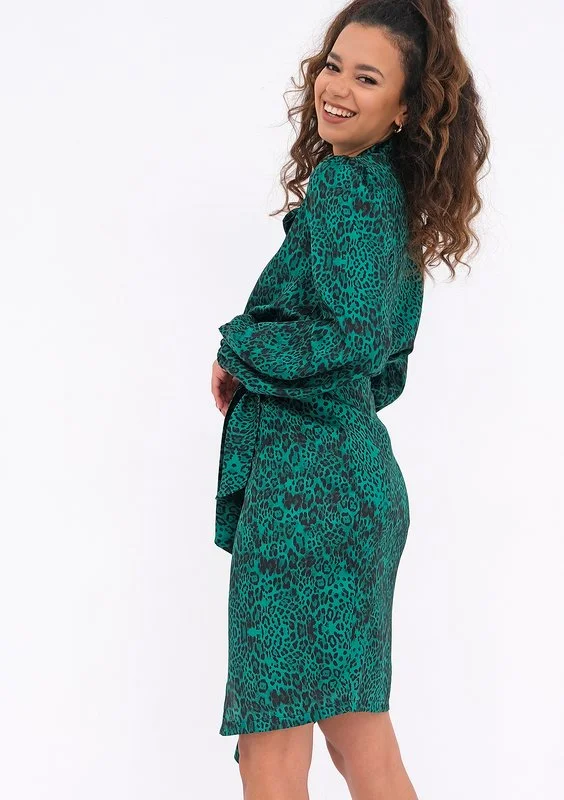 Zielona koszula w lamparcie cętki z gustownym wiązaniem przy szyi i głębokim dekoltem. Posiada długie rękawy z wygodnymi gumkami w nadgarstkach. Fason znakomicie układa się do ołówkowych spódnic i spodni z wysokim stanem.