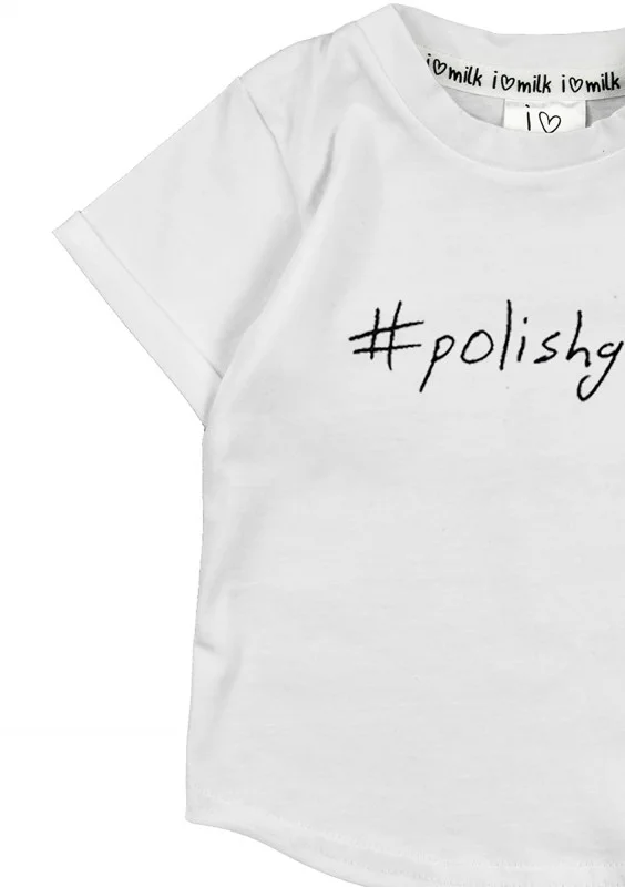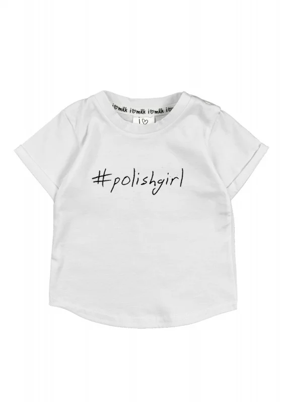 T-shirt dziecięcy z krótkim rękawem, ozdobiony nadrukiem dla dziewczynki. Uszyty z elastycznej bawełny w naturalnej bieli.