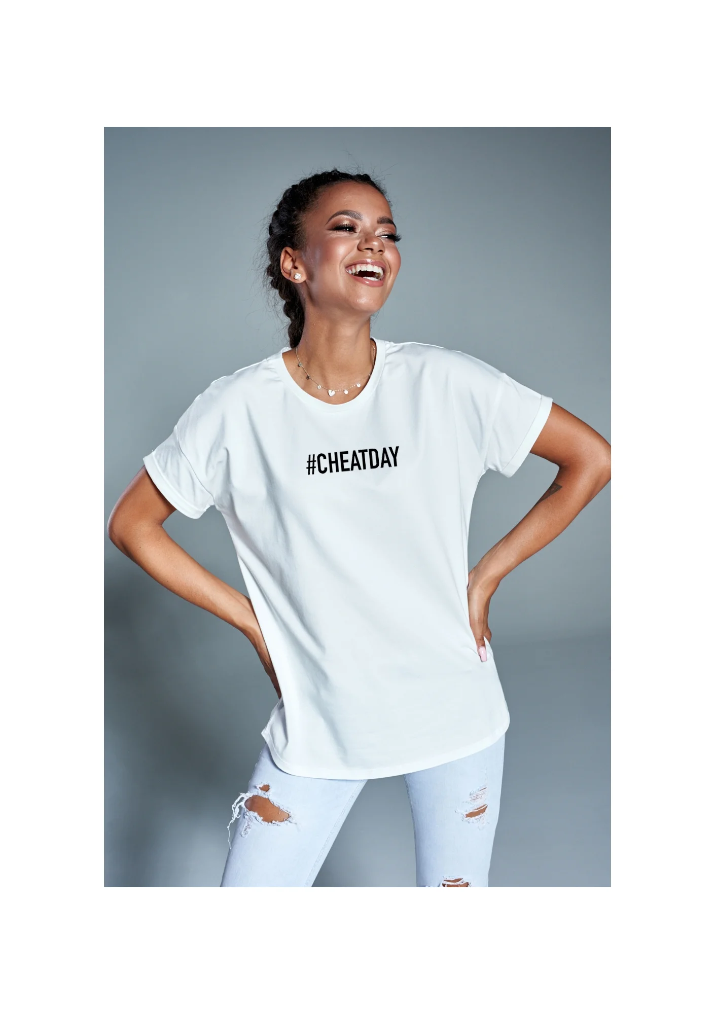 Aktualnie panuje moda na zdrowy tryb życia i wiele kobiet stosuje różnego rodzaju diety, a także często uczęszcza na siłownie. Jednak niekiedy każda z nas potrzebuje oddać się przyjemności, którą możesz już dziś wyrazić ubierając prezentowany t-shirt z nadrukiem #cheatday. Jest to modny hashtag mówiący o małych grzeszkach, które kuszą każdą, zdrowo odżywiająca się osobę. Biały kolor koszulki stanowi doskonałą bazę dla wszystkich stylizacji, dzięki czemu możesz ją wykorzystać zarówno przy tworzeniu zestawów minimalistycznych, jak i rockowych czy też typowo casualowych. Model został wykonany w 9% bawełny z dodatkiem elastycznej lycry. Tkanina świetnie się układa, a także jest odporna i zachowuje swój wygląd na długie lata. W naszej ofercie znajdziesz również inne elementy garderoby z tej serii, dlatego już dziś zapraszamy do zakupu. Nie odmawiaj sobie przyjemności tylko już dziś postaw na #cheatday!
