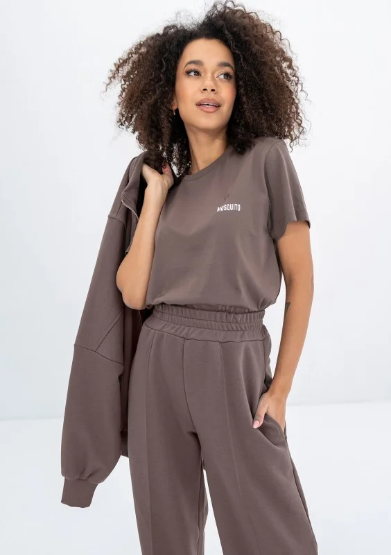 Klasyczny T-shirt damski bawełniany w brązowym kolorze. Koszulka o wszechstronnym zastosowaniu, z czystym składem.