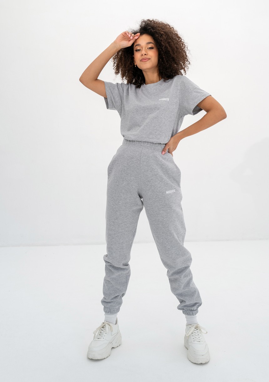 Klasyczna koszulka damska w uniwersalnym, szarym kolorze. Stylowo podkreślona białym nadrukiem loga.