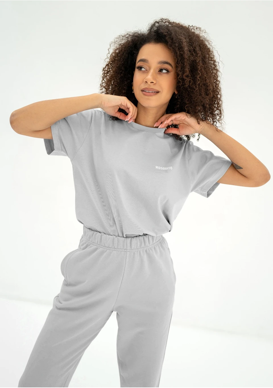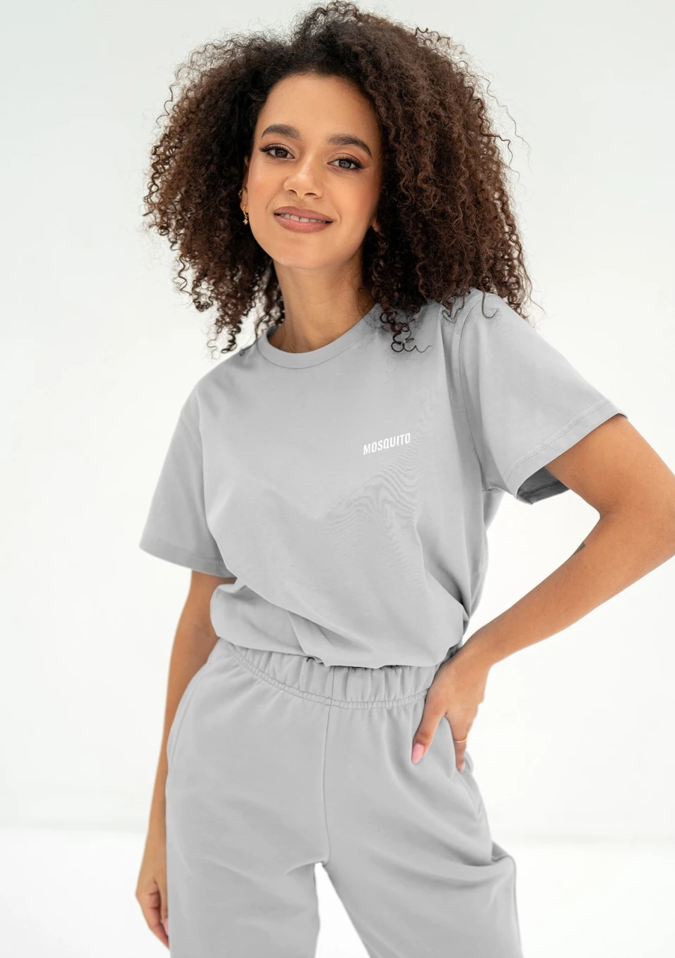 Naturalna koszulka damska z czystym, bawełnianym składem. Model w unwiersalnym, szarym kolorze, podkreślony białym logiem.
