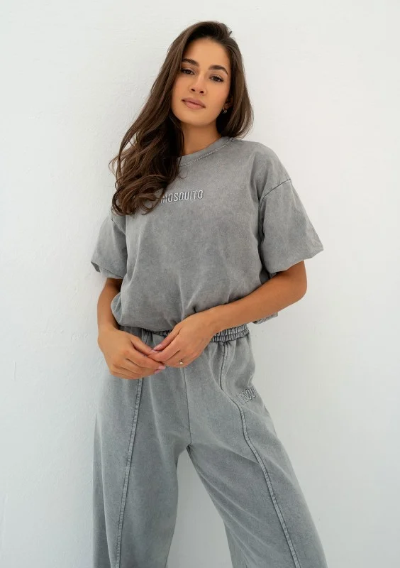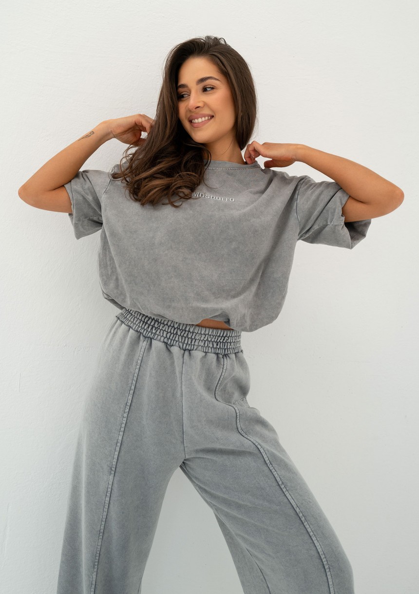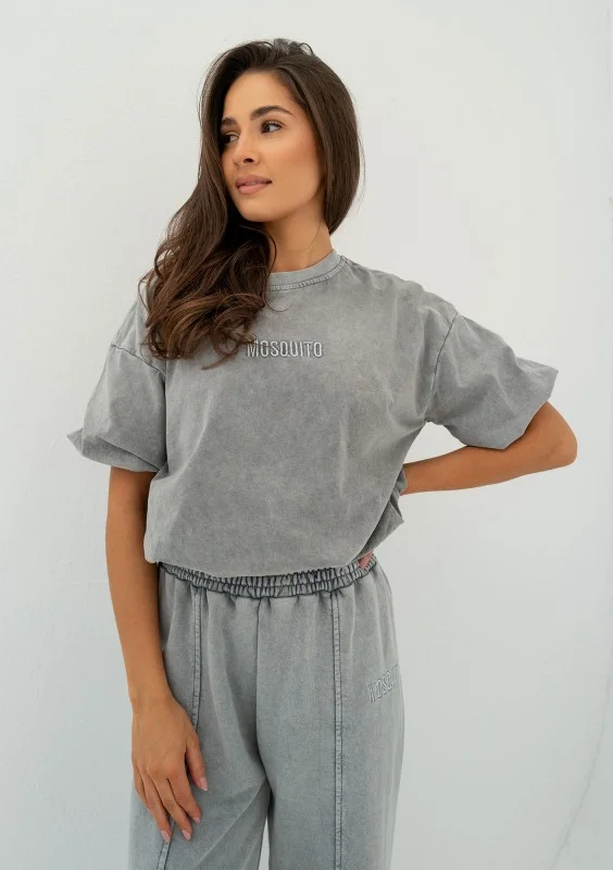 Stylowa koszulka damska w szarym kolorze z efektem sprania. Model z podszytym dołem, rękawkiem i wyszywanym logiem.