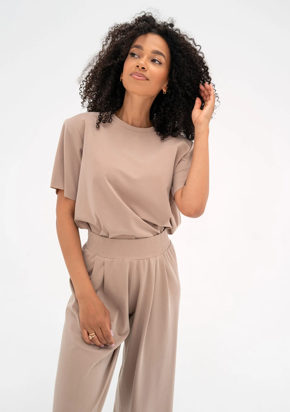 Wygodna, beżowa koszulka damska z modalu. Ma wszechstronny fason wzbogacony poduszkami, które elegancko zarysują linię barków.