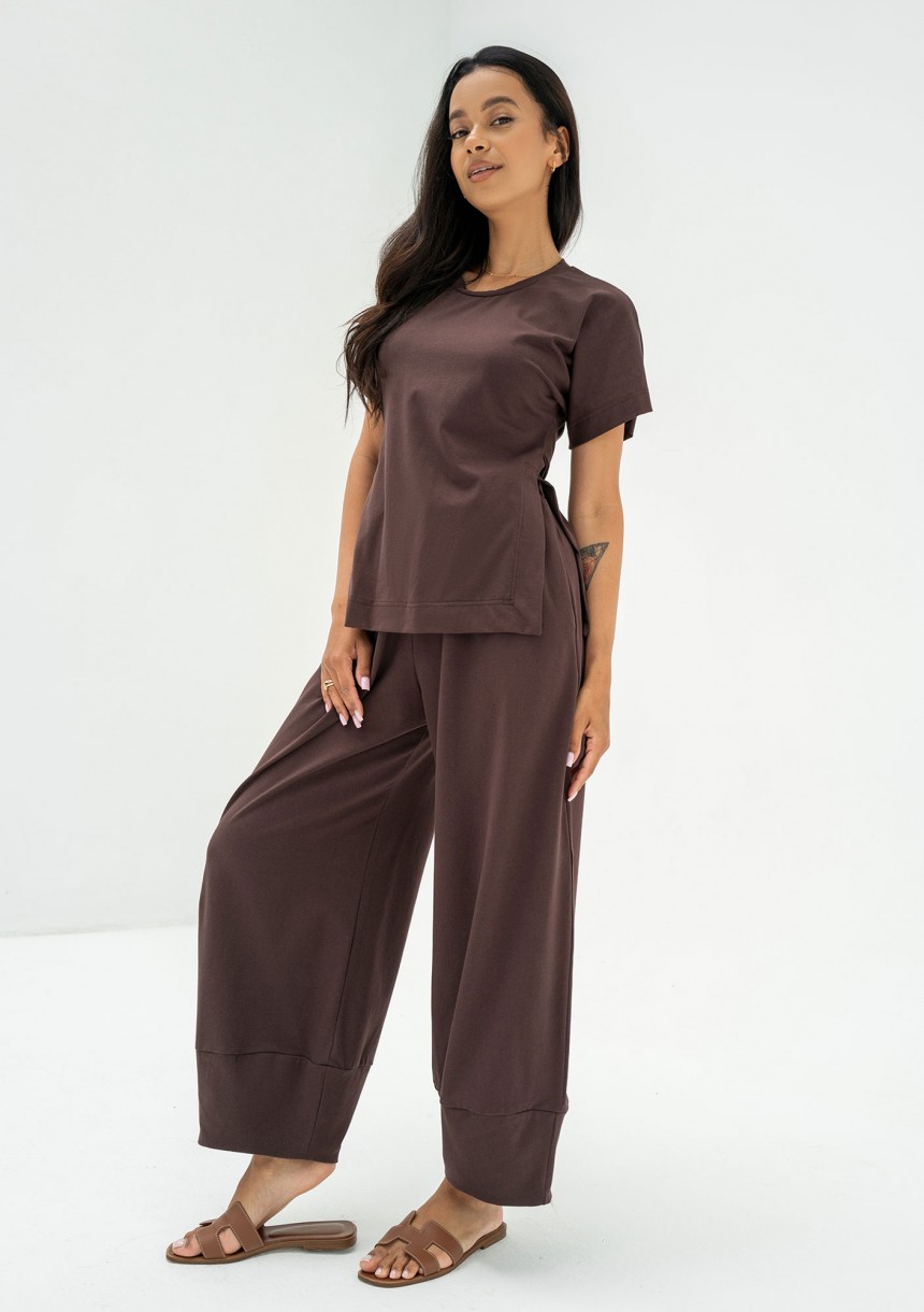 Koszulka damska w brązowym kolorze. Dzięki wiązaniu z tyłu ma delikatnie taliowany fason. Wygodnie rozcięta po bokach.