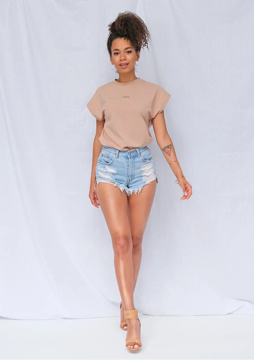 Naszym absolutnym hitem są koszulki w beżowym kolorze ze złotym logo. Złoty napis Mosquito umiejscowiony został na wysokości piersi i jest bardzo charakterystyczny. Szczególnie ładnie prezentuje się w letnim słońcu. Koszulka ma luźniejszy krój, można powiedzieć, że jest trochę oversize. Posiada oryginalnie ścięte rękawy, które dodatkowo są jeszcze wywinięte i przyszyte. Oprócz tego koszulka ma niewielki i półokrągły dekolt. Fason sprawia, że koszulkę można na przykład wsunąć do spodenek i nosić ją w taki sposób, co jest niezwykle modne. Dodatkowo połączenie beżu oraz złota doskonale podkreśli opaleniznę. Koszulki wykonane są w 95% z bawełny oraz w 5% z laycry, co czyni je przyjemnymi w dotyku, a jednocześnie wytrzymałymi i wysokiej jakości. Jest to tak zwany materiał singiel jersey. Nie rozciąga się ani się nie spiera.