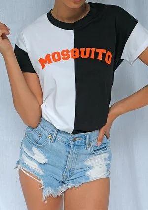 Koszulki damskie na pewno powinny być oryginalne. To właśnie od nich zależy to, jak postrzegana będzie całość stylizacji. Na pewno strzałem w dziesiątkę będzie dwukolorowy t-shirt z charakterystycznym logo. Te koszulki damskie mają prosty krój i mały, półokrągły dekolt. Mają krótki rękawek, który został oddzielony od reszty innym kolorem. Pół koszulki jest czarne, a drugie pół białe. Do tego dochodzi czarne obramowanie dekoltu oraz rękawy, które są odpowiednio białe oraz czarne. Na samym środku, na przodzie i na wysokości piersi znajduje się drukowany napis Mosquito w kolorze pomarańczowym. Logo jest bardzo charakterystyczne, głównie dzięki swojej mocnej barwie. Koszulka ma krój oversize i można tym samym włożyć ją w spodnie, co zawsze świetnie wygląda. Jej skład to 95% bawełny oraz 5% laycry. Dzięki temu jest oddychająca, przyjemna w dotyku, a jednocześnie dość elastyczna. Sprawia to, że zachowuje ona doskonały wygląd nawet po wielu praniach oraz noszeniach.