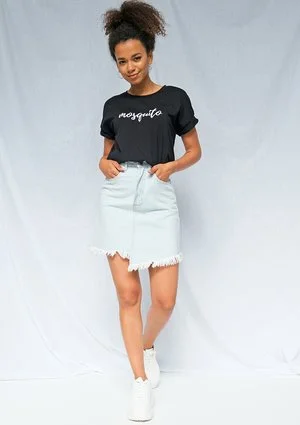 Znajdująca się w naszej ofercie prosta koszulka typu t-shirt z logo sprawiającym wrażenie napisanego odręcznie, to prawdziwy hit! Koszulka jest czarna, dzięki czemu jej noszenie daje wiele możliwości i kolorystycznie dopasuje się ona dosłownie do wszystkiego. Jest ona lekko oversize, co jest teraz w modzie. Posiada niewielki, półokrągły dekolt, a jej tył jest gładki i pozbawiony ozdób. Krótki rękawek jest dodatkowo wywinięty, co tworzy bardzo interesujący i przyciągający uwagę efekt. Na wysokości piersi znajduje się napis, który sprawia wrażenie napisanego odręcznie. Jest to biała nazwa Mosquito. Logo w tej formie wygląda fenomenalnie. Cała koszulka wykonana została z przyjemnego w dotyku materiału, który dodatkowo jest wysokiej jakości i nie zmienia swojego kształtu nawet po wielu założeniach. Jej skład to w 95% bawełna, a w 5% elastyczna laycra. Koszulka jest oddychająca i w sam raz na lato.
