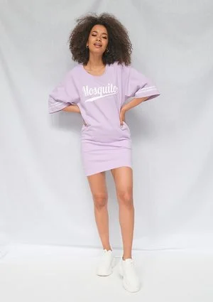 Czy tunika może być sportowa i niezobowiązująca? Jak najbardziej tak! Wystarczy spojrzeć na naszą najnowszą propozycję, czyli tunikę z logo marki. Przede wszystkim uwagę zwraca jej prosty krój. Jest to tunika, którą spokojnie można wykorzystać w roli sukienki, ponieważ długością sięga do połowy uda. Ma dość oversizowy charakter i jest luźniejsza. Posiada rozszerzane, luźne rękawy, które sięgają aż do łokcia. Dekolt natomiast jest niewielki i półokrągły. Jest to tunika bardzo prosta, nie jest zwężana ani dopasowana. Można przewiązać ją na przykład przykuwającym uwagę paskiem lub wstążką. Dodatkowym atutem jest jej kolorystyka. Liliowy zdecydowanie jest kolorem tego sezonu i trudno przejść wobec niego obojętnie. W tym przypadku połączony został także z białymi wstawkami. Na wysokości biustu znajduje się bowiem drukowany napis Mosquito, a pod spodem since 2009 w cienkiej, również białej ramce. Czcionka jest oryginalna i z powodzeniem przyciąga wzrok. Białe wstawki w postaci pasków pojawiły się także na dolnej części rękawów. Tunika wykonana została w 95% z bawełny oraz w 5% z laycry. Dzięki temu jest przyjemna w dotyku, miękka, a jednocześnie dość elastyczna. Nie mechaci się w czasie prania ani nie rozciąga.Kupić ją można w czterech wersjach rozmiarowych, czyli w rozmiarze XS, S, M oraz L. Jest to standardowa rozmiarówka.