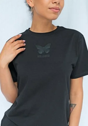 Prezentowana damska koszulka z krótkim rękawem to produkt uszyty w Polsce z wysokiej jakości tkaniny bawełnianej. Ubranie jest miękkie w dotyku, oddychające i delikatnie rozciągliwe. Dobrze układa się na ciele, nie krępuje ruchów, a także nie podrażnia skóry. T-shirt charakteryzuje się maksymalną prostotą i uniwersalnością. Ma jednolicie czarny kolor o intensywnym nasyceniu, a jego jedyną ozdobę stanowi równie czarny nadruk firmowy i logo z motylem, które delikatnie połyskują. Bluzka jest zatem produktem bazowym, który łatwo dopasowuje się do innych elementów odzieży, a jej noszenie pozwala na skuteczne zakamuflowanie wielu niedoskonałości figury.