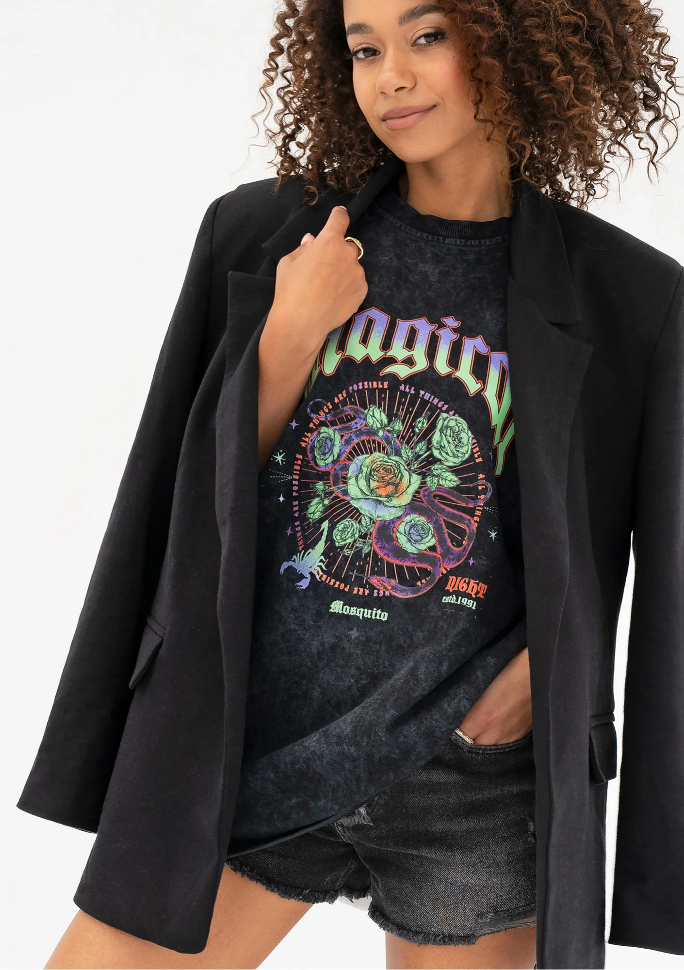 Ta modna koszulka zawsze doda Twoim stylizacjom pazurka! Posiada nieco rockowy styl. Możesz nosić ją przez cały rok, nadaje się do wszechstronnego użytkowania. W składzie znajduje się wyłącznie bawełna, bez żadnej domieszki. T-shirt świetnie się układa, zapewnia swobodę i daje poczucie pełnego komfortu. Luźny krój maskuje niedoskonałości sylwetki. Koszulka została ozdobiona kolorową aplikacją i napisami. W ofercie znajdziesz wiele różnych wariantów tego fasonu. W Mosquito znajdziesz wyłącznie polskie koszulki damskie, co oznacza zarówno rodzimy projekt, jak i lokalną produkcję.