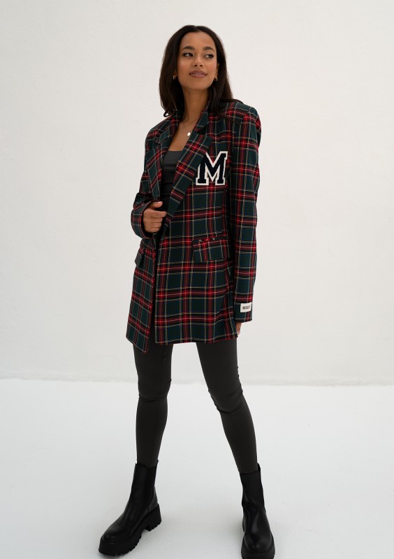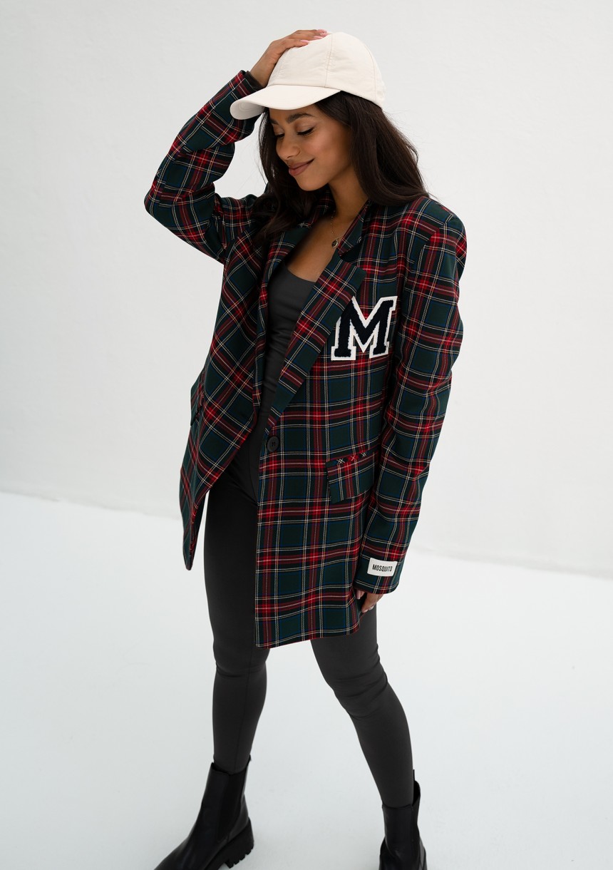 Długa marynarka damska w szkocką kratę, zdobiona naszywką ,,M" i logiem marki. Oversizowy fason dla miłośniczek niebanalnych trendów.