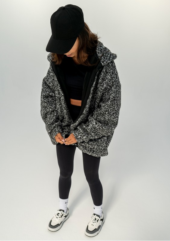 Moda na obfite formy oversize wciąż trwa. Stylowa kurtka damska rozpinana z kapturem została wykonana z melanżowej, przyjemnie ciepłej bukli.