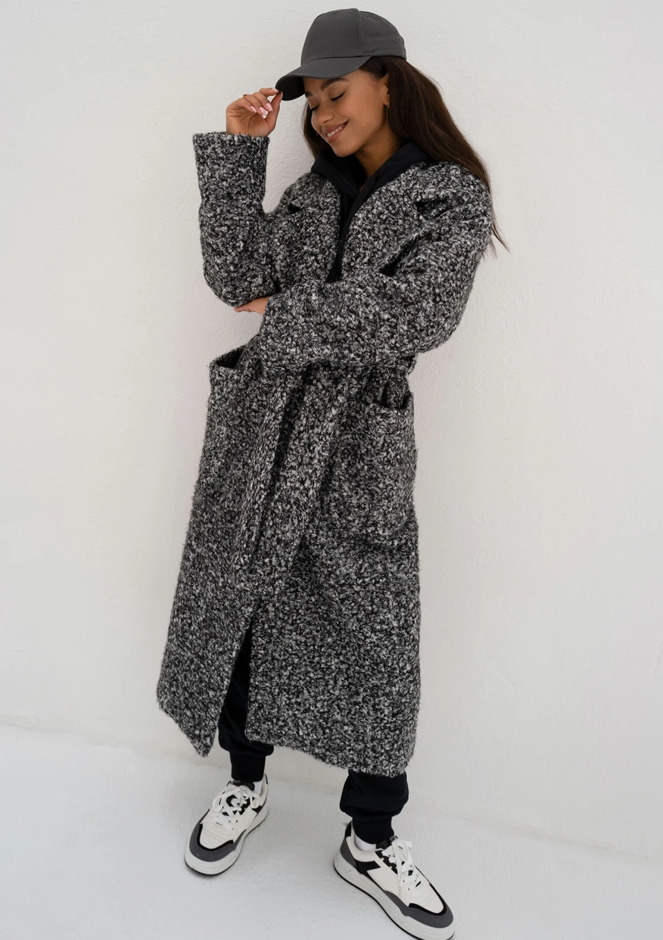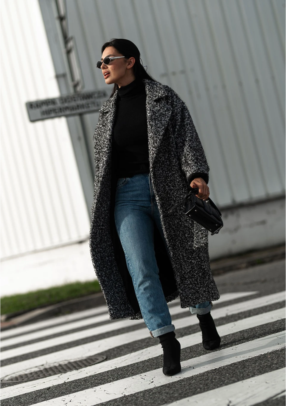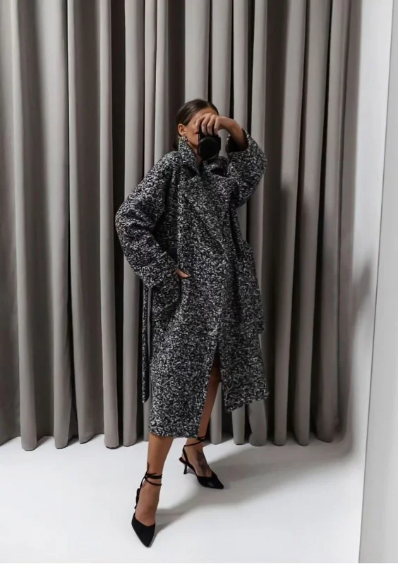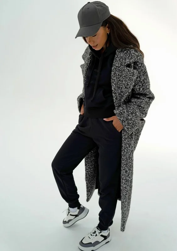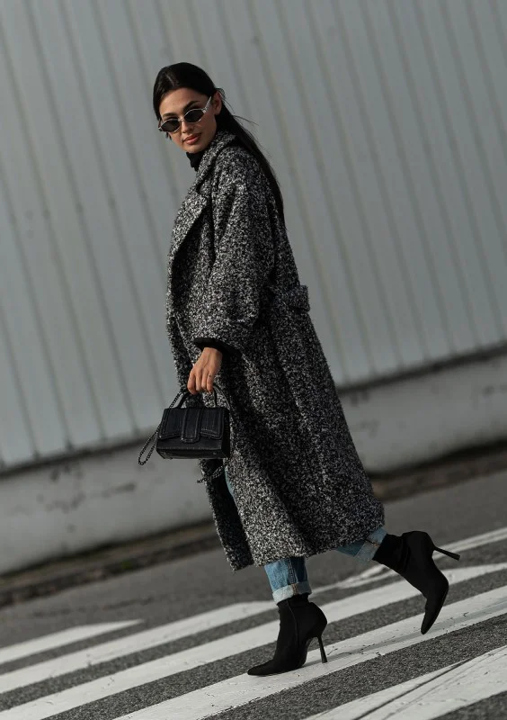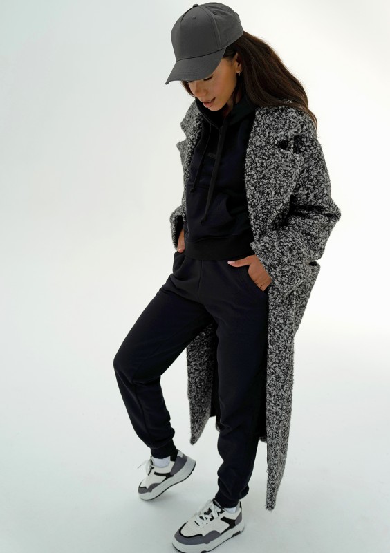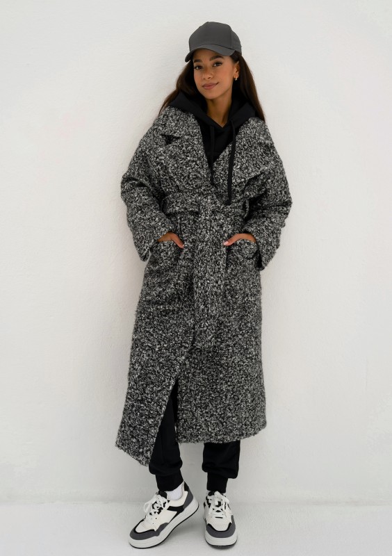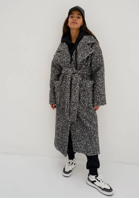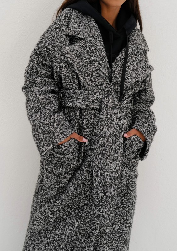 Klasycznie skrojony, elegancki płaszcz damski z dzianiny o kędzierzawej strukturze włókien. Wykonany w czarno - białym melanżu.