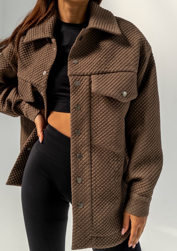 Designerska kurtka damska o koszulowym kroju, wykonana w nugatowym brązie. Najmodniejsze zwieńczenie jesiennych stylizacji!