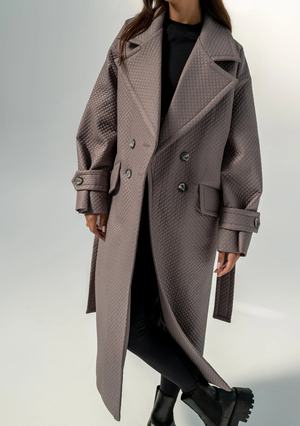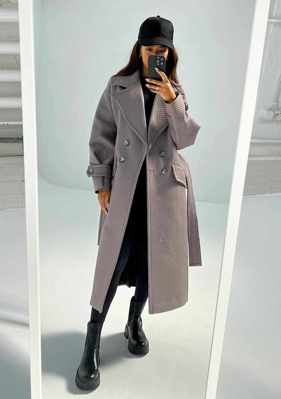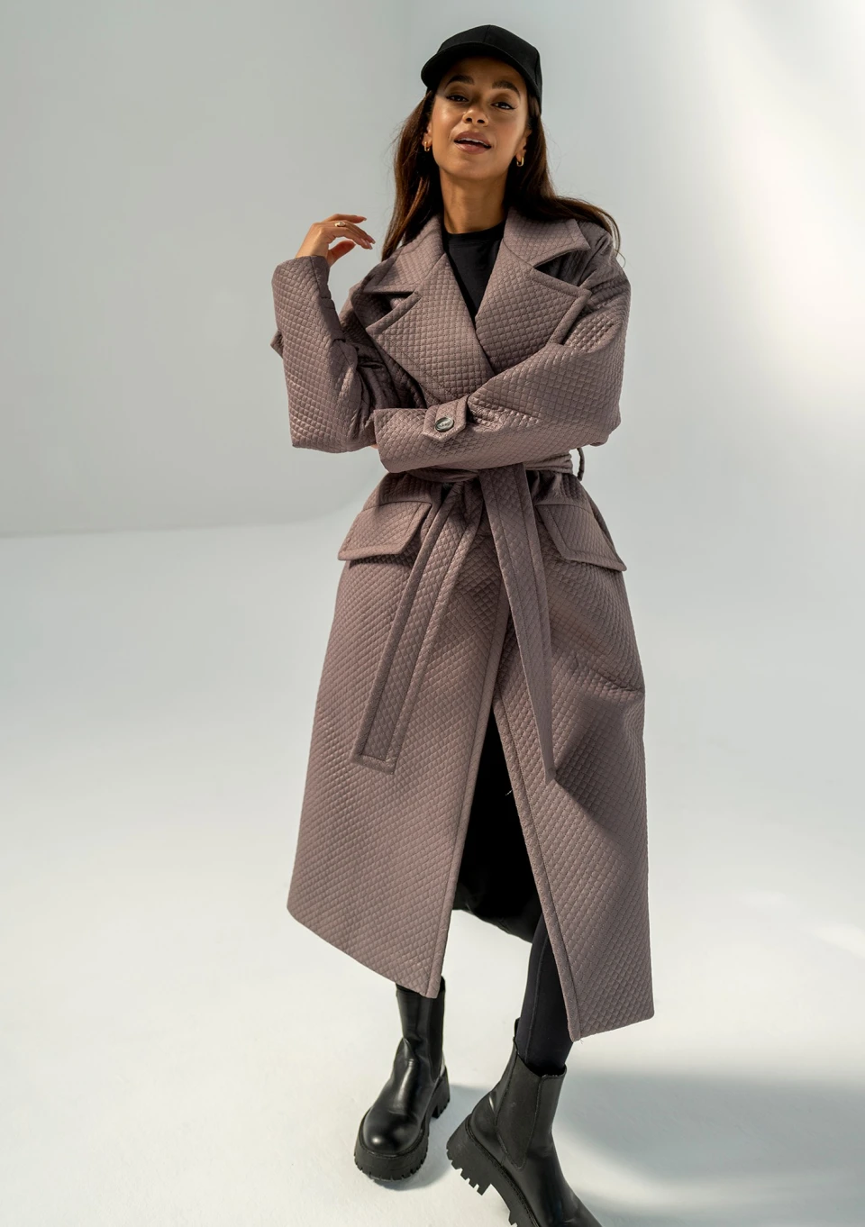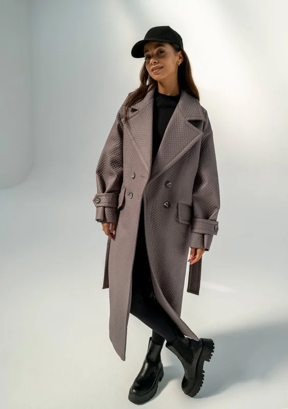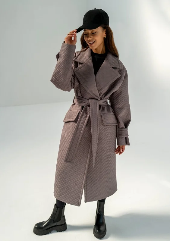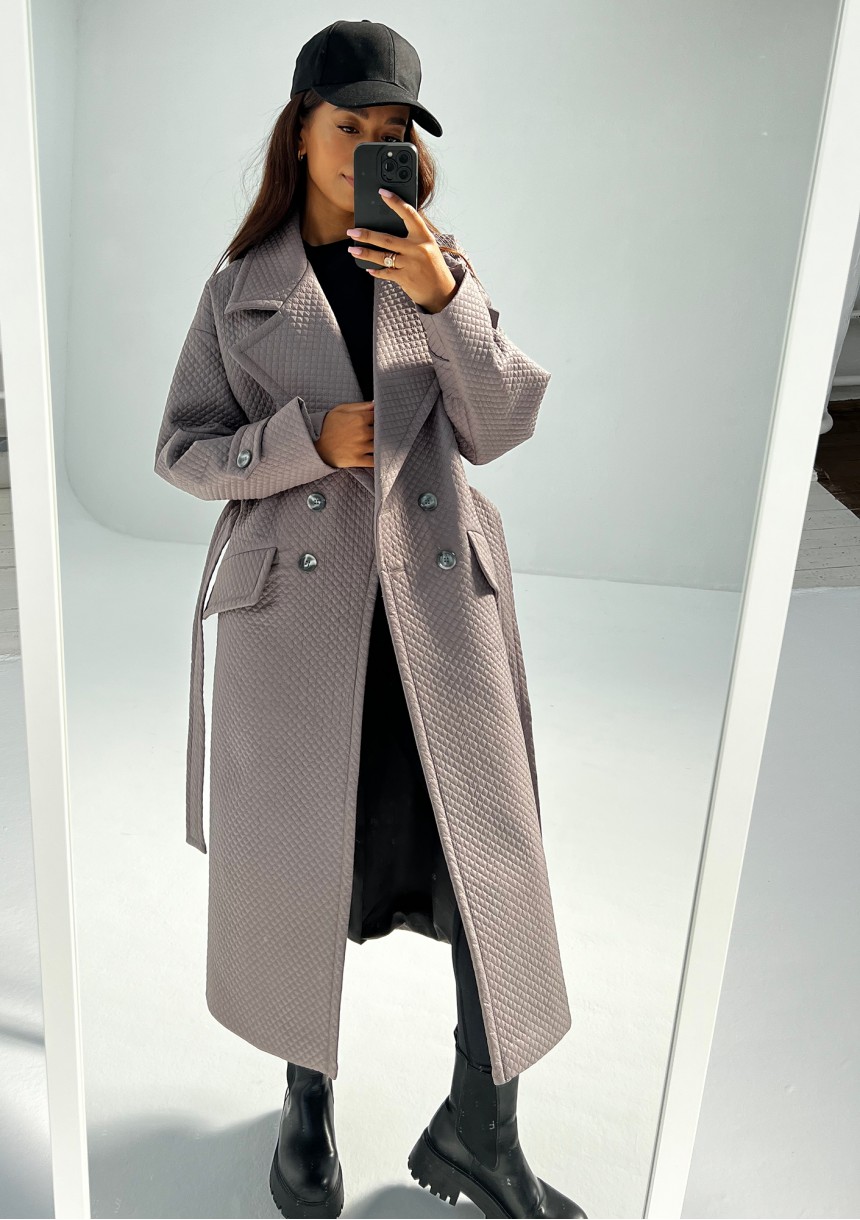 Stylowy trencz damski z paskiem, kieszeniami i eleganckim kołnierzem. Wykonany z pikowanego materiału w eleganckim kolorze taupe.