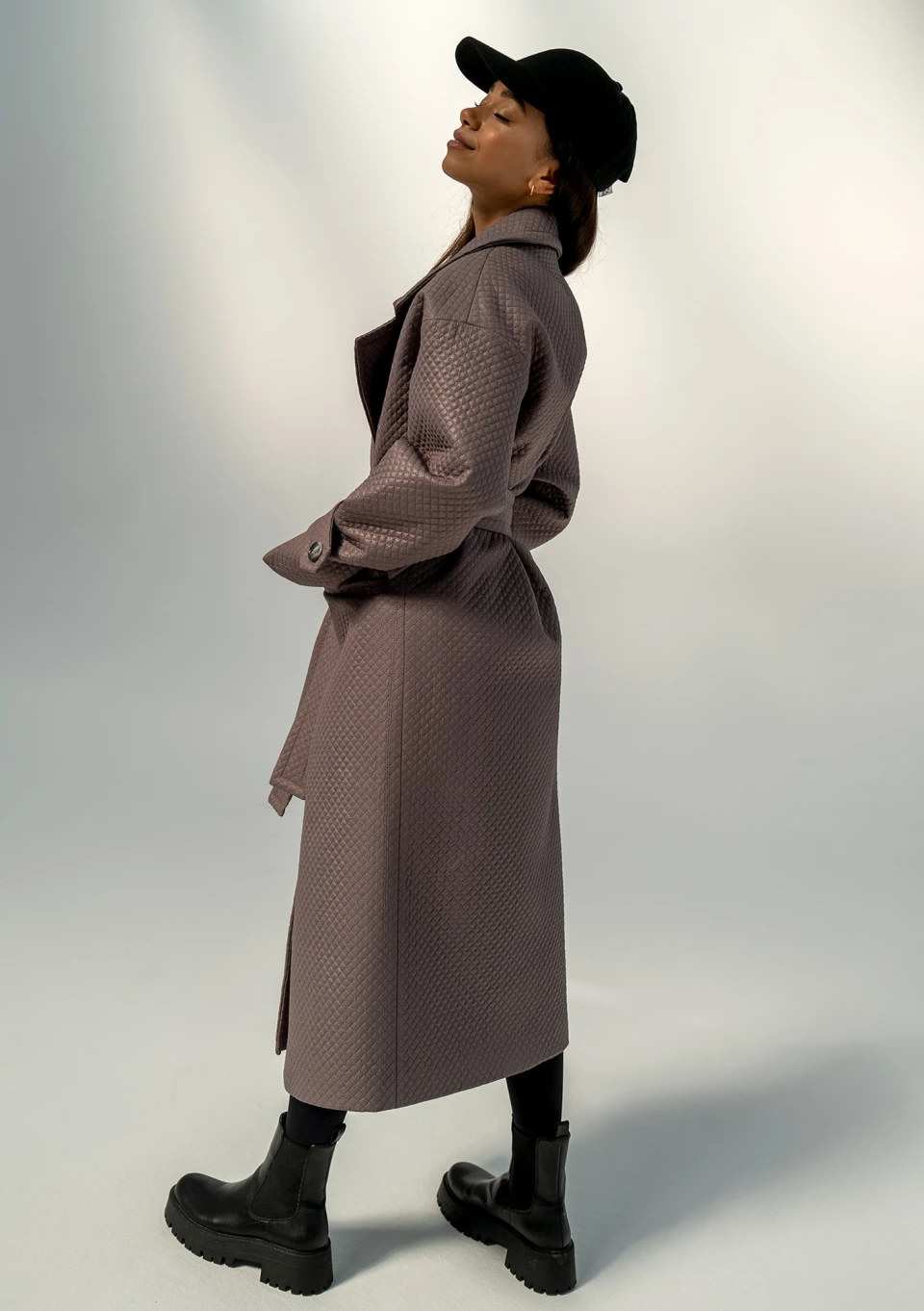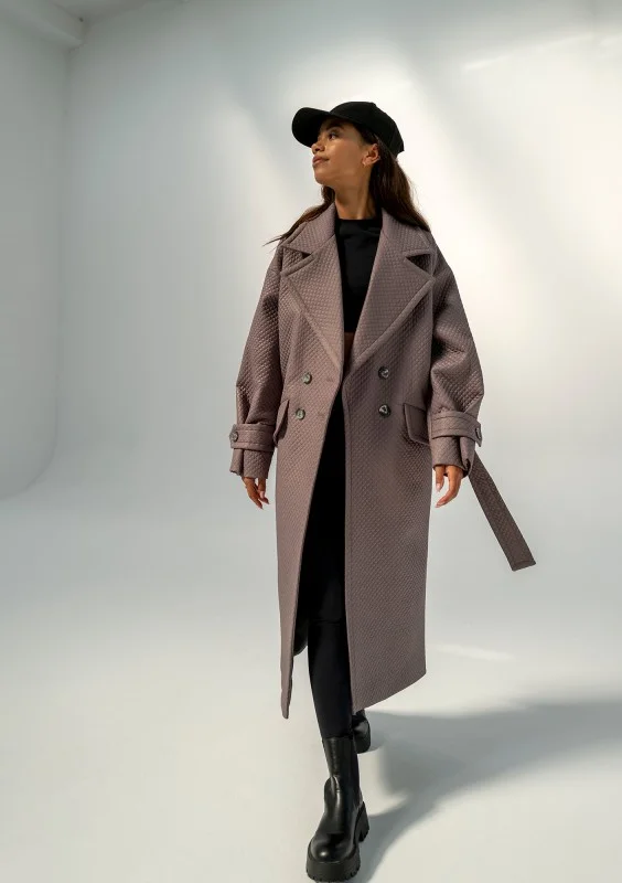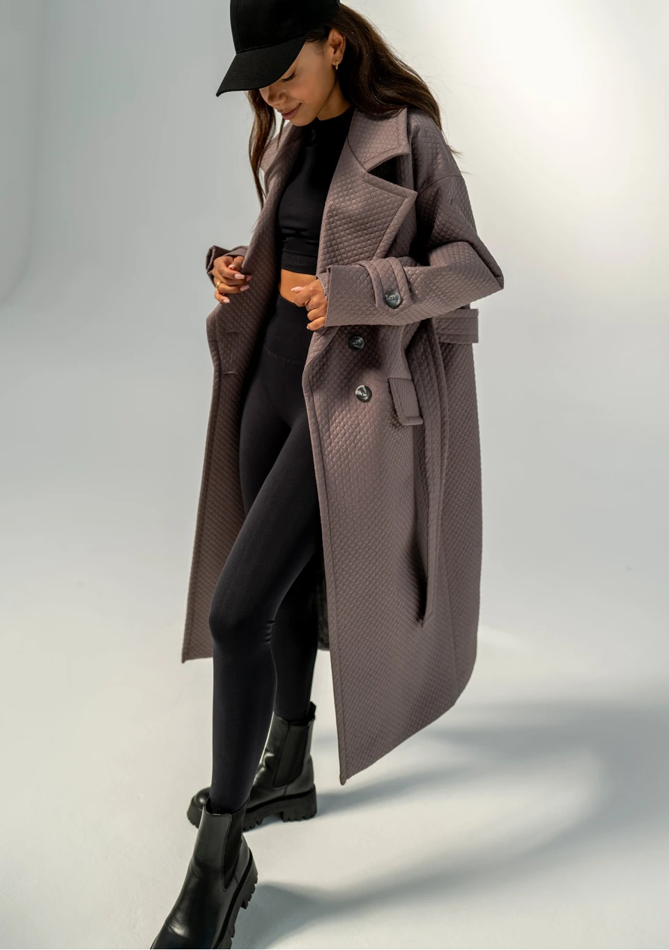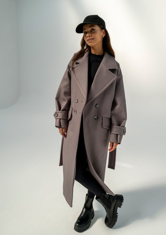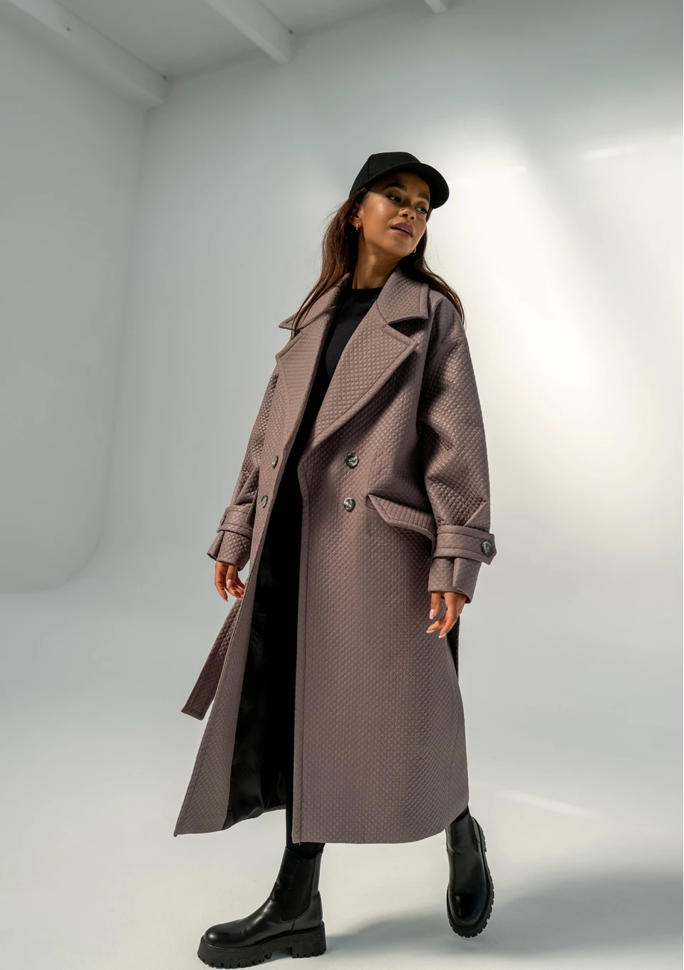 Stylowy trencz damski z paskiem, kieszeniami i eleganckim kołnierzem. Wykonany z pikowanego materiału w eleganckim kolorze taupe.