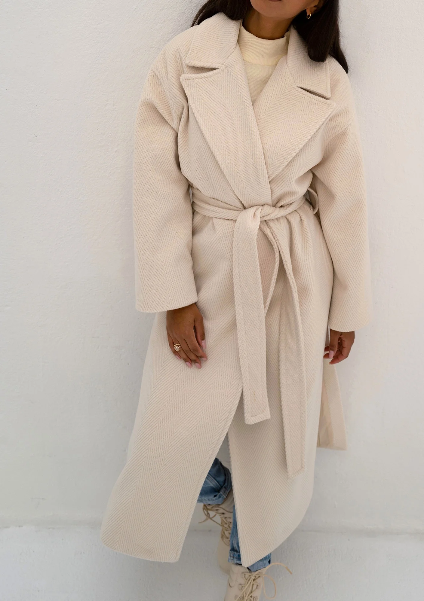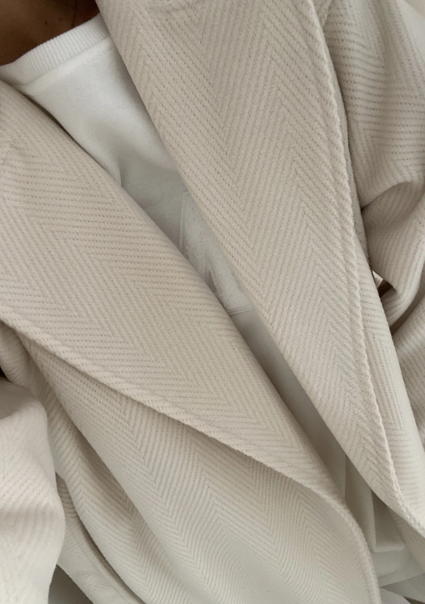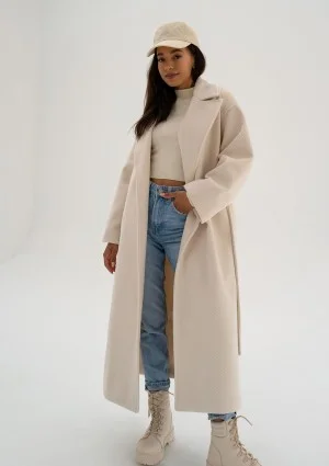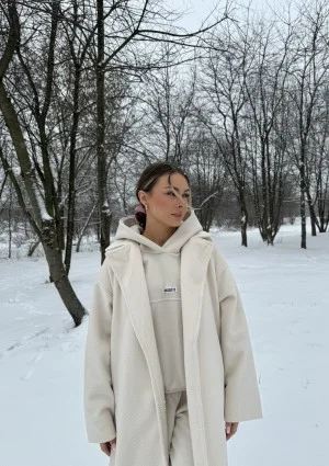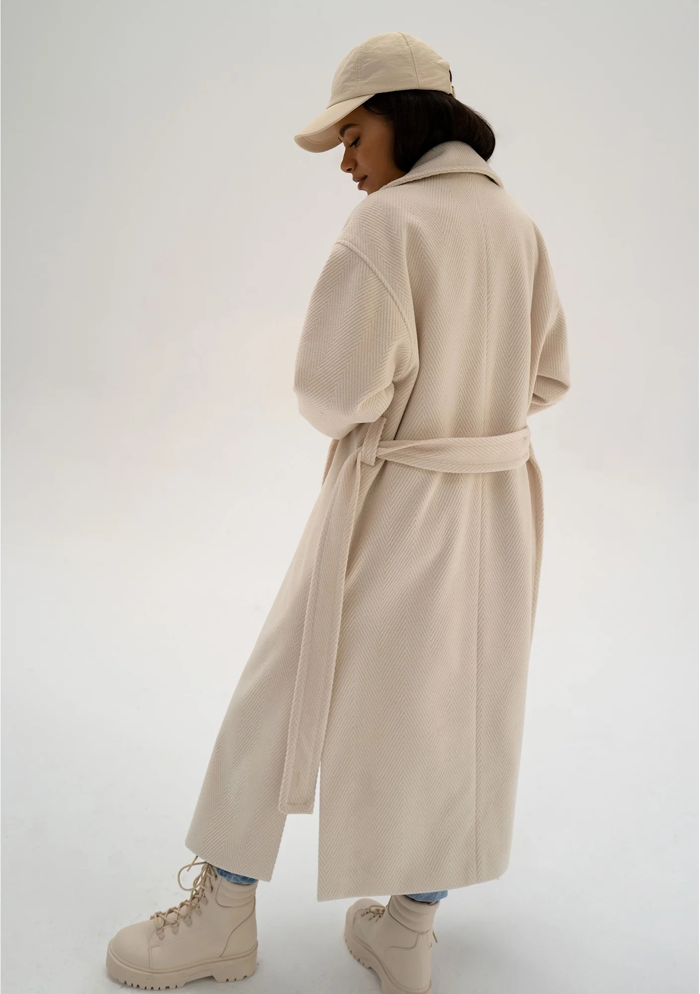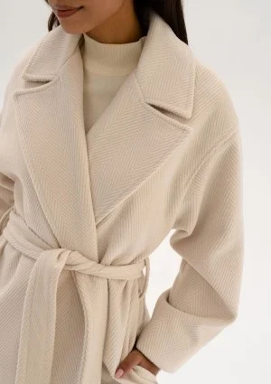Kremowy płaszcz damski z paskiem jest esencją minimalizmu i elegancji. Ten model daje pewność udanej stylizacji. Najpiękniej będzie wyglądał w połączeniu z jasnymi ubraniami, bez kolorystycznych kontrastów. Estetyka z zachowaniem wyłącznie białych i kremowych tonów zapewni bardzo delikatny efekt. Salve to płaszcz z piękną fakturą jodełki, wykonany z ciepłej dzianiny. Obecna podszewka. Idealnie sprawdzi się jesienią i w cieplejsze, zimowe dni.